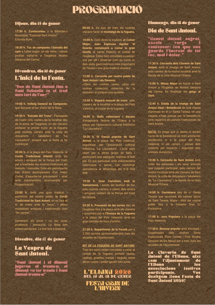 El regidor de Cultura Festiva, Juan Espinosa, ha destacat que aquestes festes són una expressió viva de la identitat elianera, una manera de retrobar-nos com a poble al voltant del foc, la música i la convivència: “convidem a tota la ciutadania a participar i a continuar transmetent aquestes tradicions a les noves generacions”.