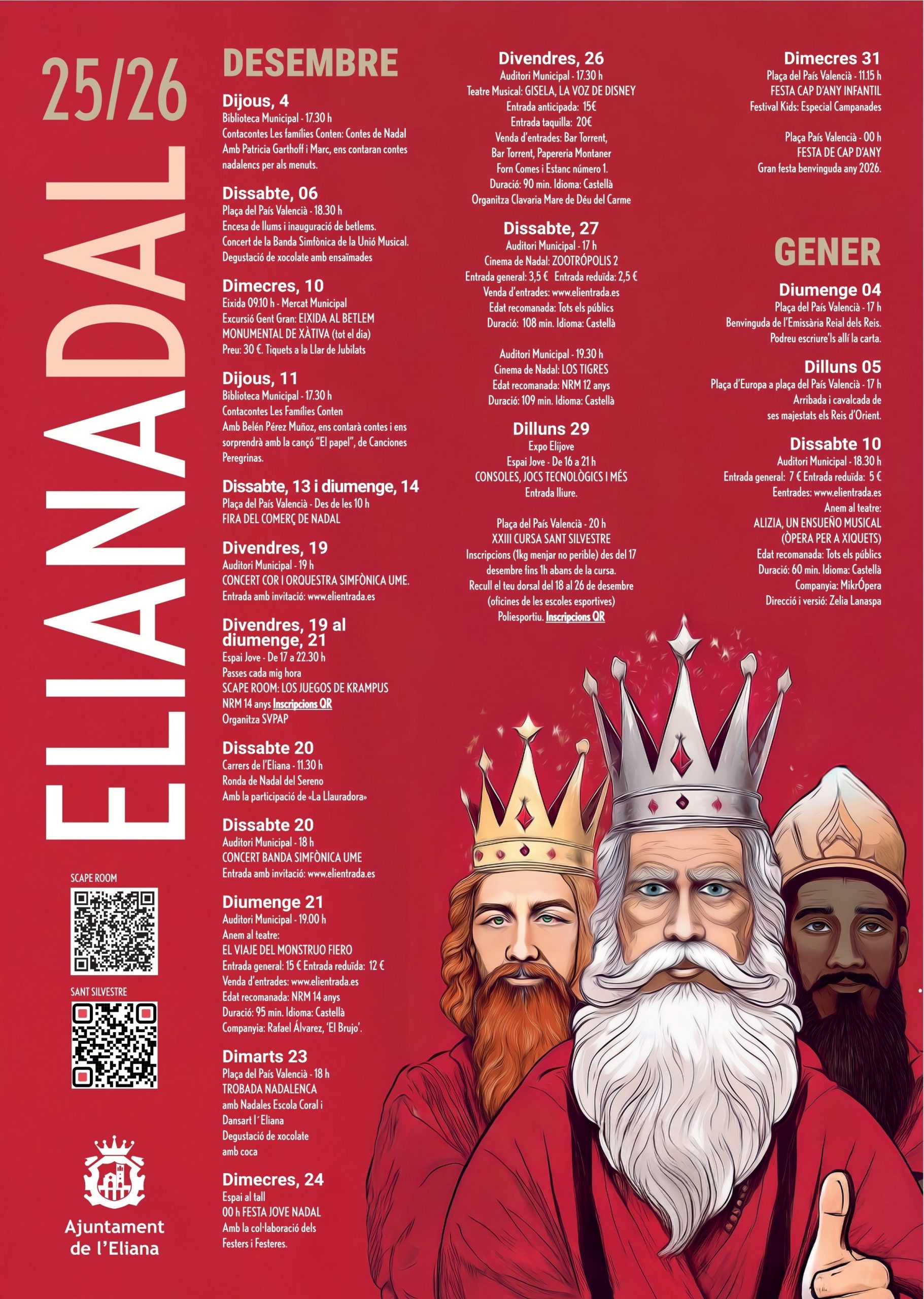 L’Ajuntament de l’Eliana ha donat a conéixer la programació completa d’EliaNadal 2025/2026, el calendari municipal que reuneix més d’una trentena de propostes dirigides a tots els públics i que es desenvoluparan entre el 4 de desembre i el 5 de gener.