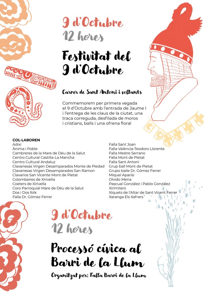 • 12 hores. Festivitat del 9 d’octubre. Carrer de Sant Antoni i voltants. Commemorem per primera vegada el 9 d’Octubre amb l’entrada de Jaume I i l’entrega de les claus de la ciutat, una traca correguda, desfilada de moros i cristians, balls i una ofrena floral.