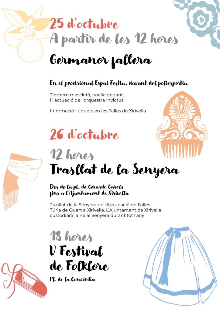 • 25 d’octubre: 12 hores. Germanor Fallera. En el provisional Espai Festiu, davant del poliesportiu. Tindrem mascletà, paella gegant… i l’actuació de l’orquestra Invictus. Informació i tiquets en les Falles de Xirivella.