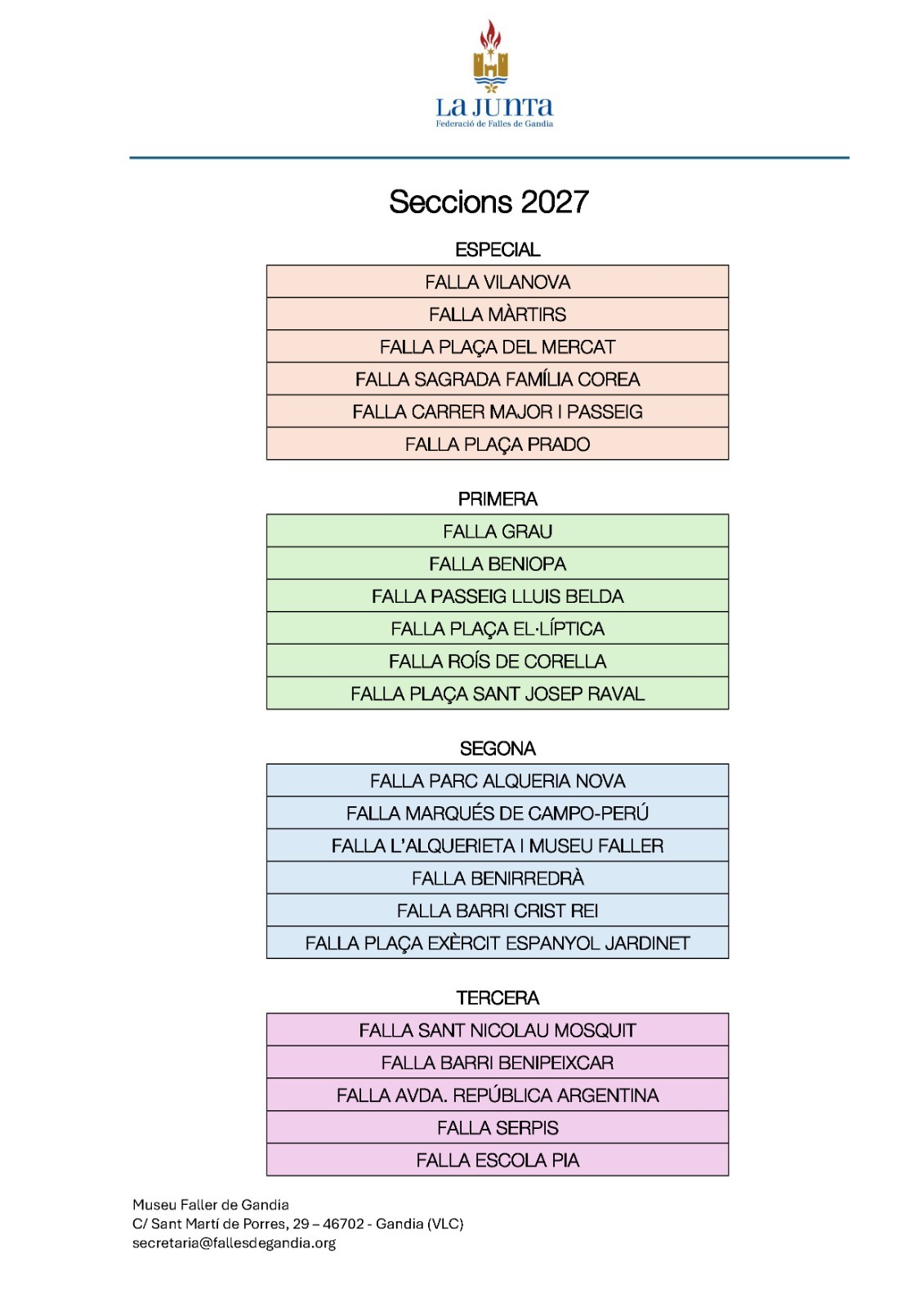Les Falles de Gandia ja coneixen la distribució definitiva per seccions de les 23 comissions falleres de la ciutat de cara a l’exercici 2027. Després que el passat 9 de setembre l’Assemblea de les Falles de Gandia aprovara, amb 18 vots a favor, la proposta presentada per diverses comissions per a modificar la classificació per seccions, la nova estructura ja és una realitat.