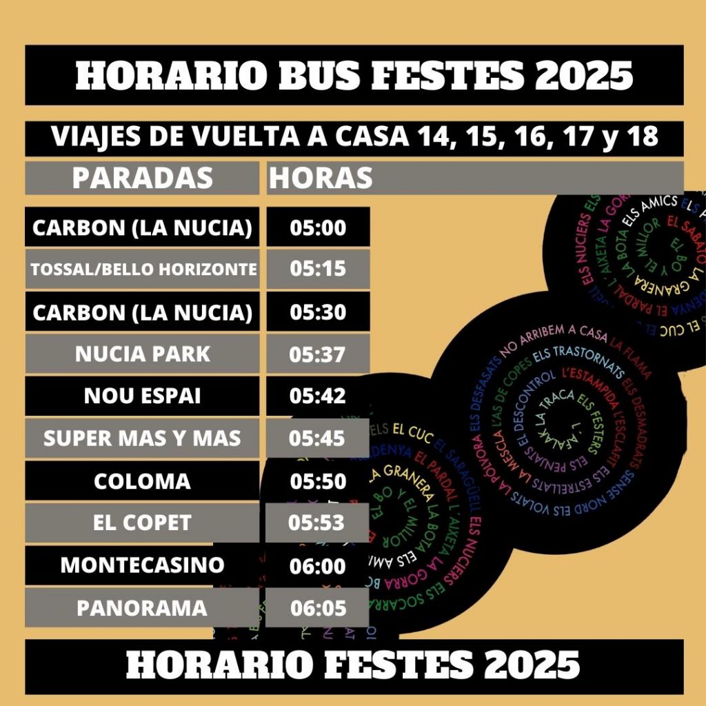 El Ayuntamiento de La Nucía ha organizado servicio extraordinario de autobús con motivo de les “Festes d’Agost” 2025. Habrá servicio de autobús de “vuelta a casa”, todas las noches de fiestas para garantizar un retorno seguro de los festeros y festeras que viven en casco urbano y urbanizaciones. Será para todas las edades y totalmente gratuito, no hará falta el carnet de Tramús Bus. Habrá un retorno a las 5 de la madrugada hacia urbanizaciones Tossal y Bello Horizonte y otro a las 5,30 hacía el resto de urbanizaciones.