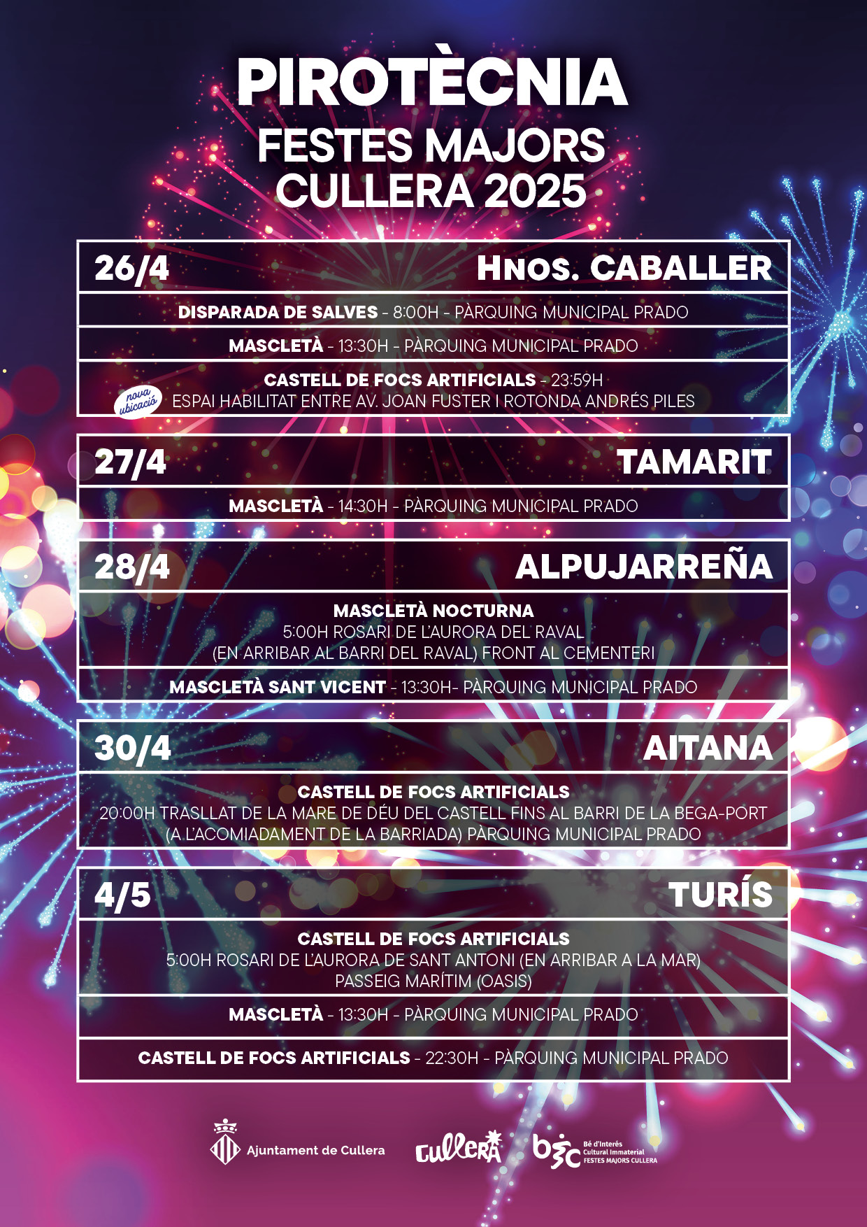 Per a celebrar els dies grans de festa, l’Ajuntament de Cullera ha preparat un calendari pirotècnic de gran nivell amb mascletades diürnes i nocturnes, així com amb castells de focs artificials. Seran les piroctècniques Hermanos Caballer, Tamarit, Alpujarreña, Aitana i Turís, les encarregades d’omplir de pólvora i fer que la ciutat vibre els dies 26, 27, 28, 30 d’abril i 4 de maig, dia de la Pujà de la Moreneta.