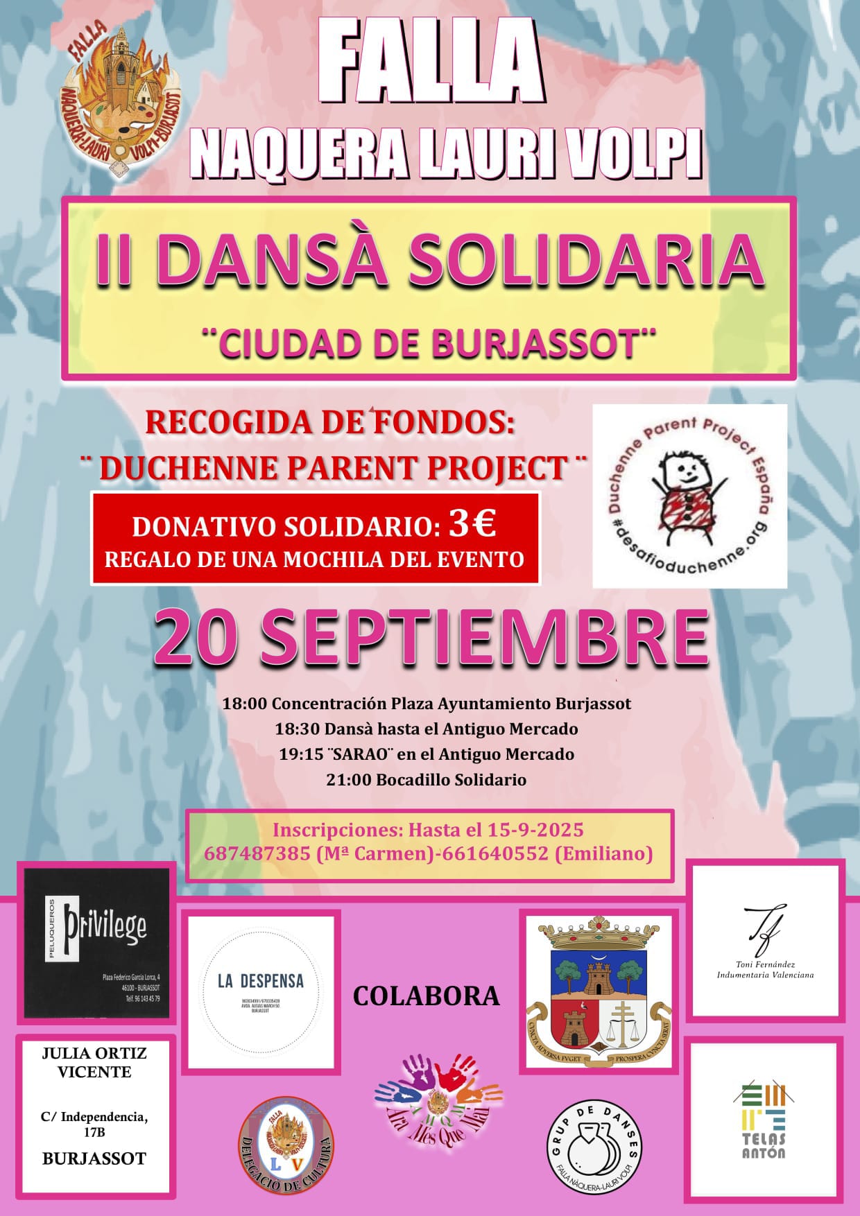 Con la misma ilusión que el pasado año y con las ganas de que todas y todos los participantes disfruten de una gran tarde solidaria y festiva, la Falla Náquera- Lauri Volpi de Burjassot ya lo tiene todo preparado para celebrar su II Dansà Solidaria Ciudad de Burjassot que tendrá lugar el sábado 20 de septiembre a partir de las 18.00 horas. Acto que cuenta con la colaboración del Ayuntamiento de Burjassot, desde la Concejalía de Fallas, dirigida por Estefanía Ballesteros.