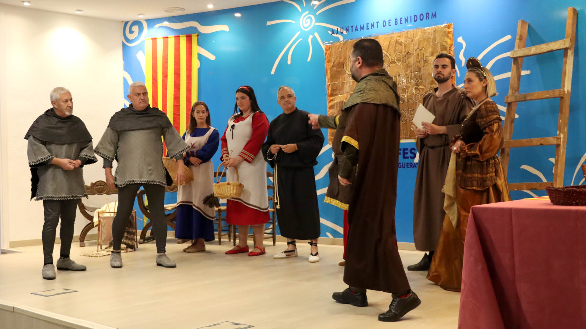 El Salón de Actos de la Casa del Fester se llenó de público la tarde noche de ayer, jueves, para presenciar el sainete ‘Pudo suceder’, interpretado por un grupo de peñistas de la Associació de Penyes Verge del Sofratge de Benidorm y que imagina en clave de humor cómo pudo ser la redacción de la Carta de Poblament de Benidorm del almirante Bernat de Sarrià el 8 de mayo de 1325.