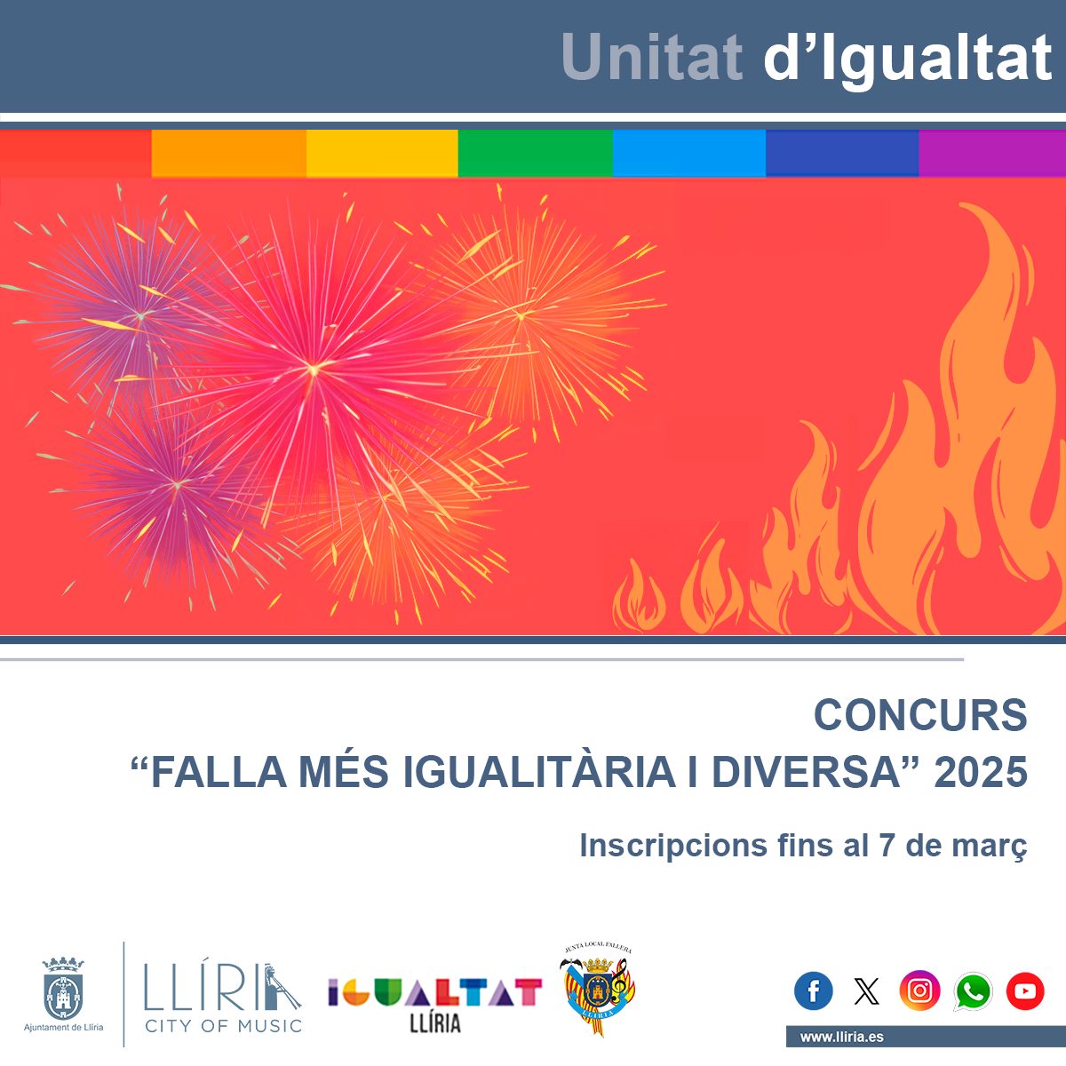 El Ayuntamiento de Llíria, a través de la Concejalía de Igualdad, ha convocado la segunda edición del Concurso “Falla més Igualitària i Diversa”, dirigido a las comisiones falleras de la localidad.