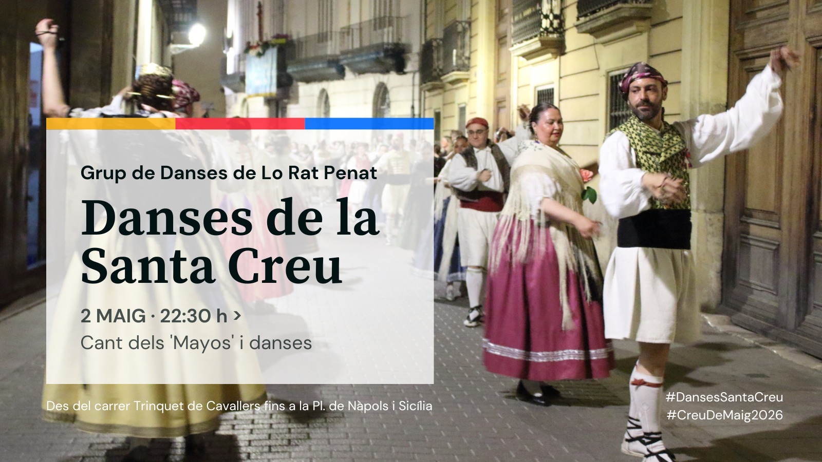 Un any més, i en motiu de la Festa de la Santa Creu i del tradicional Concurs de les Creus de Maig que organisa la Societat d’Amadors de les Glòries Valencianes, el Grup de Danses de Lo Rat Penat plantarà una creu de flors en la frontera de la sèu de l’entitat, situada en el carrer Trinquet de Cavallers, n. 9 de la ciutat de Valéncia.