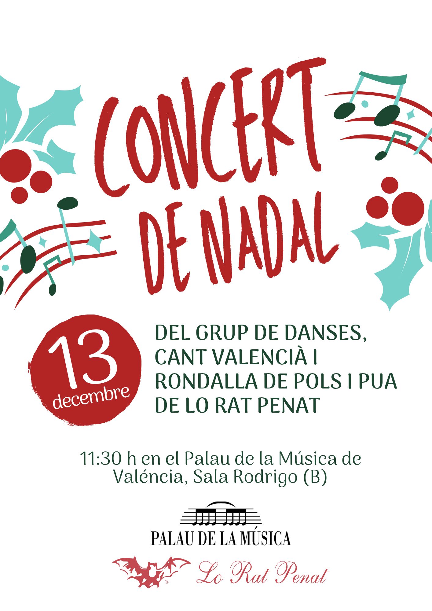 Lo Rat Penat celebrarà el seu tradicional Concert de Nadal el dissabte 13 de decembre, a les 11:30 hores, en la Sala Rodrigo (B) del Palau de la Música de Valéncia.