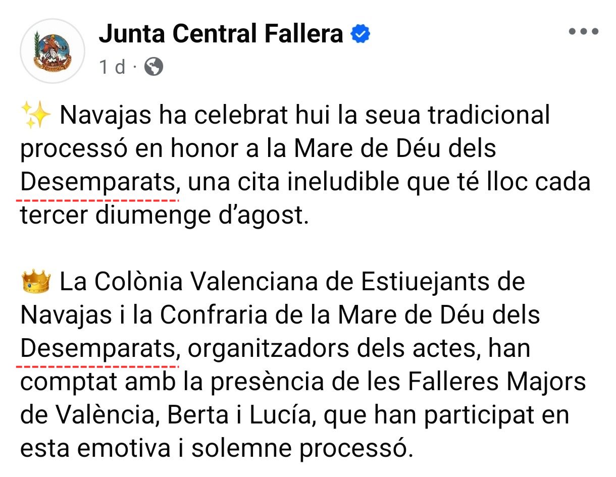 Resulta inadmissible que una entitat oficial, que deu velar per la promoció i la dignificació de les festes falleres, utilise grafies i formes alienes al valencià. El nom de la nostra Patrona és Mare de Deu dels Desamparats, i aixina deu escriure’s sempre, en el degut respecte a la devoció i a l’identitat llingüística del nostre poble.