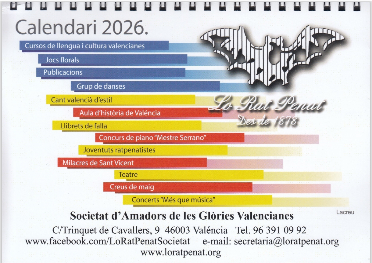 El Calendari Lo Rat Penat 2026 recull les efemèrides valencianes més destacades i s’ha editat tant en format de calendari de taula com en calendari de paret, en un contengut dedicat a temes relacionats en l’història, llengua i cultura valencianes.