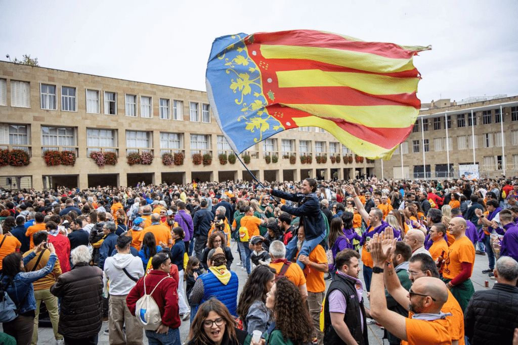 Un acto emotivo, tras el que todos han bajado a la Plaza del Ayuntamiento, donde una multitud de personas esperaba el desfile de falleros y falleras y de autoridades, que se ha instalado en un escenario junto a las banderas.