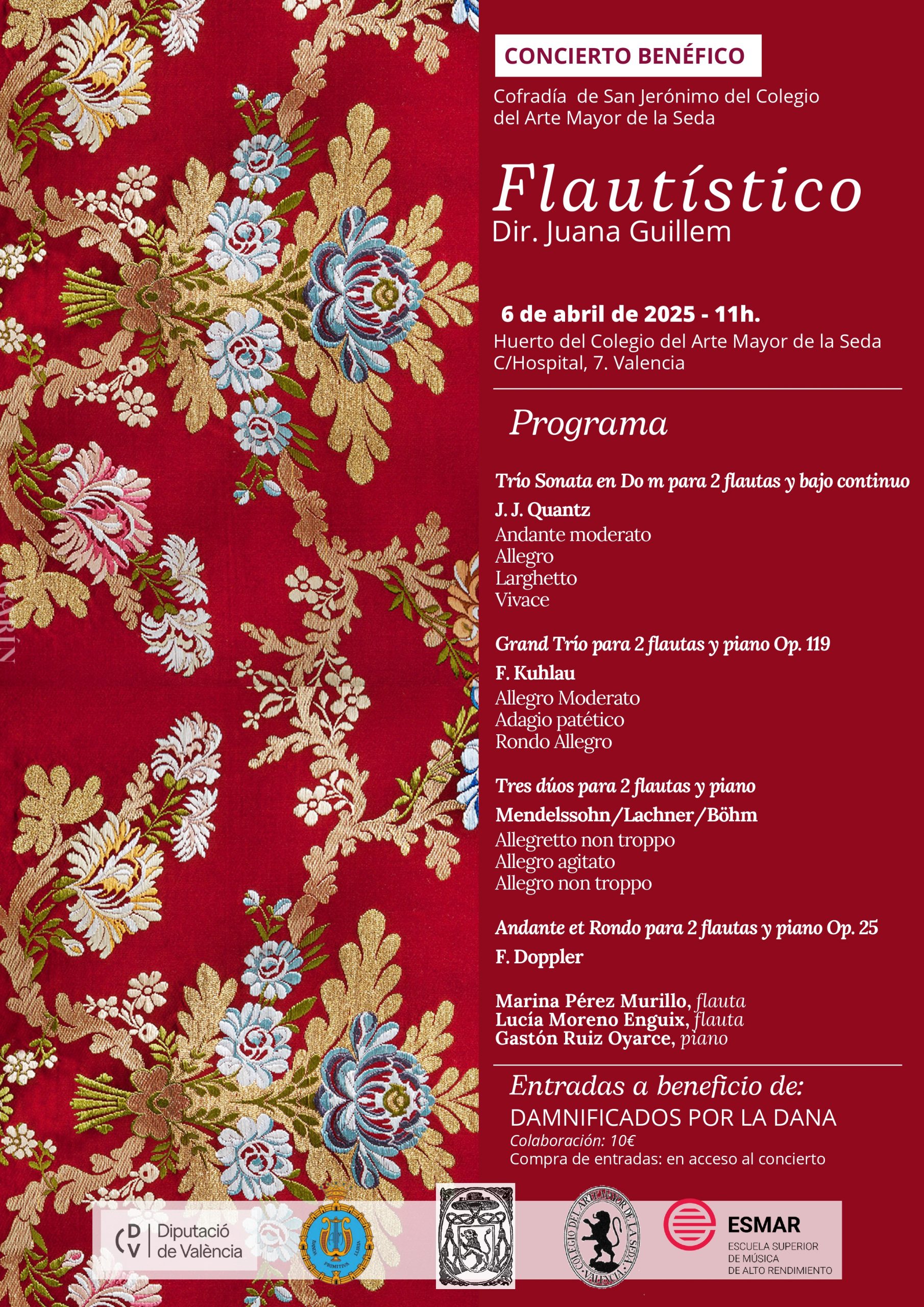 En esta ocasión, Juana Guillem, dirigirá a Marina Pérez Murillo, flauta, Lucía Moreno Enguix, flauta, y Gastón Ruiz Oyarce, piano. Entre las piezas que se van a interpretar, cabe mencionar el Trío Sonata en do menor para dos flautas y bajo continuo, de J. J. Quanz, o el Grand Trío para dos flautas y piano Op. 119, de F. Kuhlau.