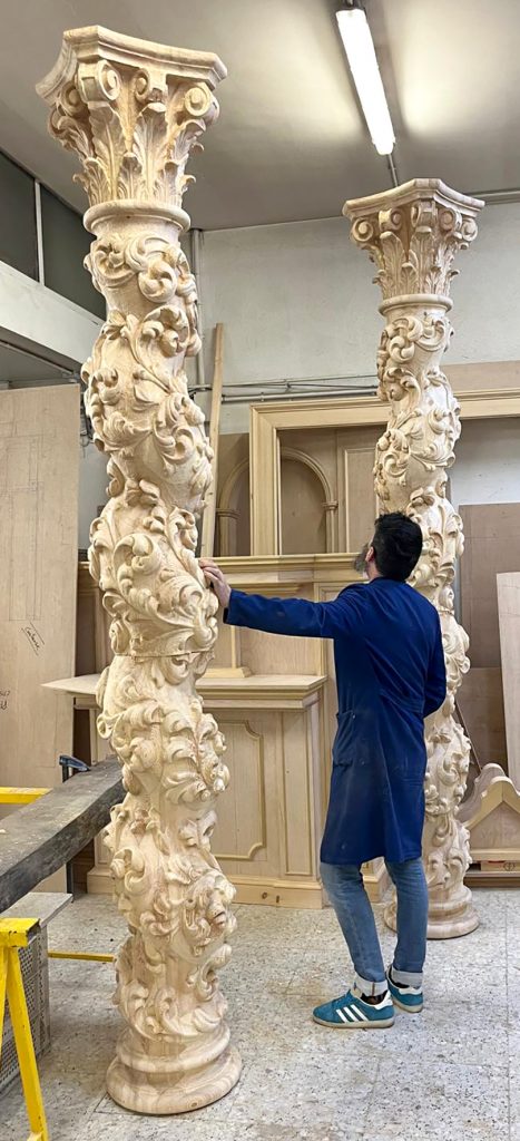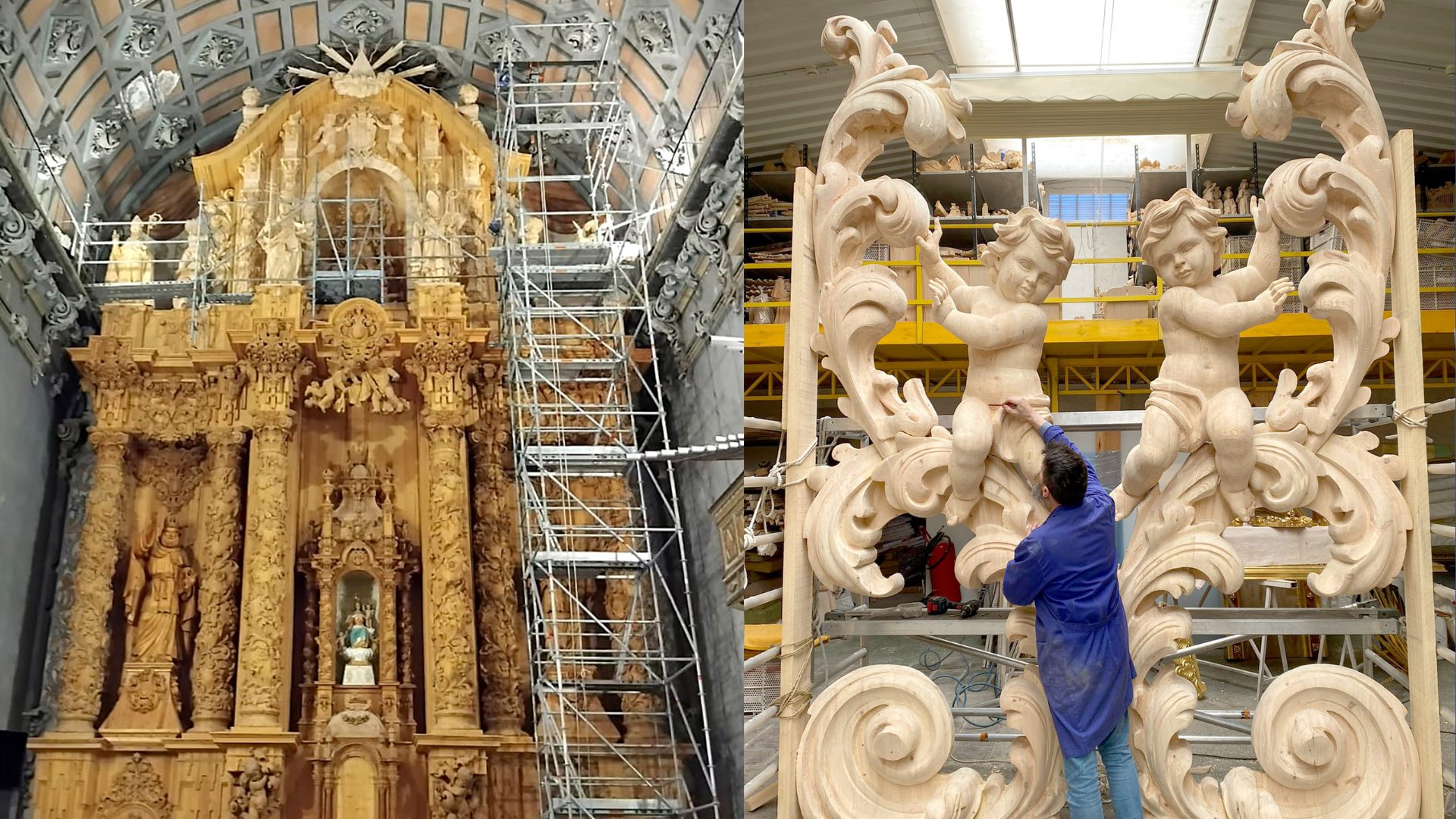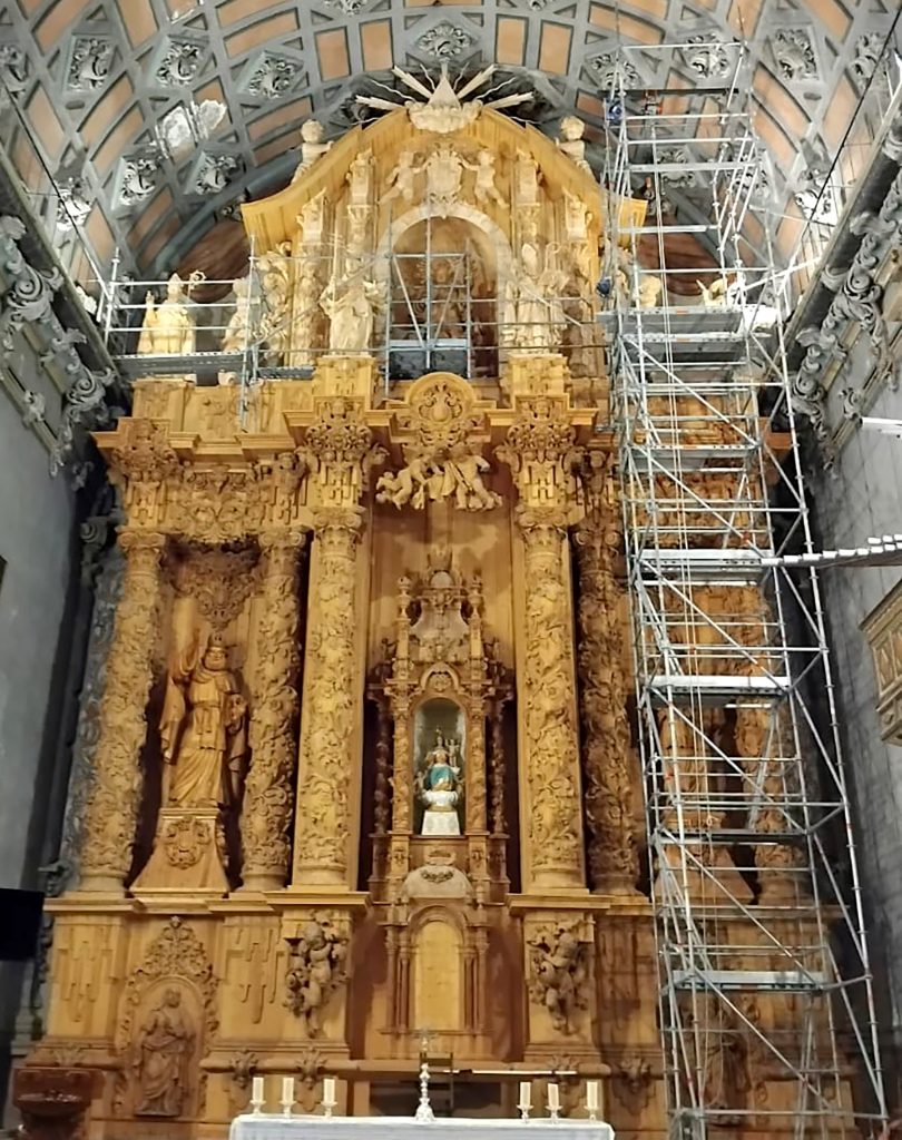 El retablo es una reconstrucción del original de estilo barroco y está labrado en madera de abeto y de pino rojo de Suecia, y alberga en el centro una imagen de la Virgen de los Ángeles, titular de la parroquia, y en los laterales dos imágenes de seis metros, de Aarón y otra de Melquisedec, “por ser referencia eucarística. En las portaladas de bajo están los relieves de San Pedro y San Pablo, columnas de la Iglesia, y en la parte superior, se pueden ver a los cuatro doctores de la Iglesia de occidente; San Jerónimo; San Agustín; San Ambrosio; y San Gregorio Magno, y la imagen de Nuestra Señora de los Ángeles, culminado con una referencia a la Santísima Trinidad”, indica el párroco.