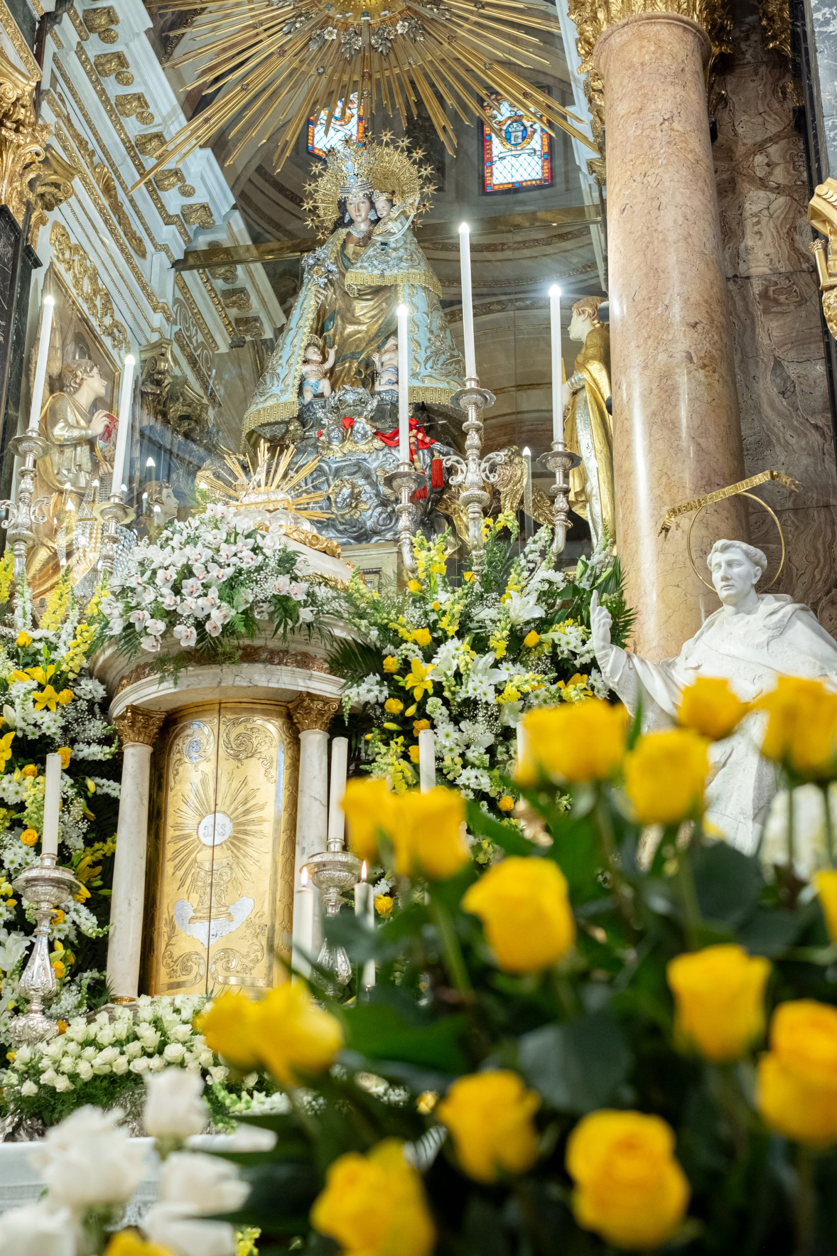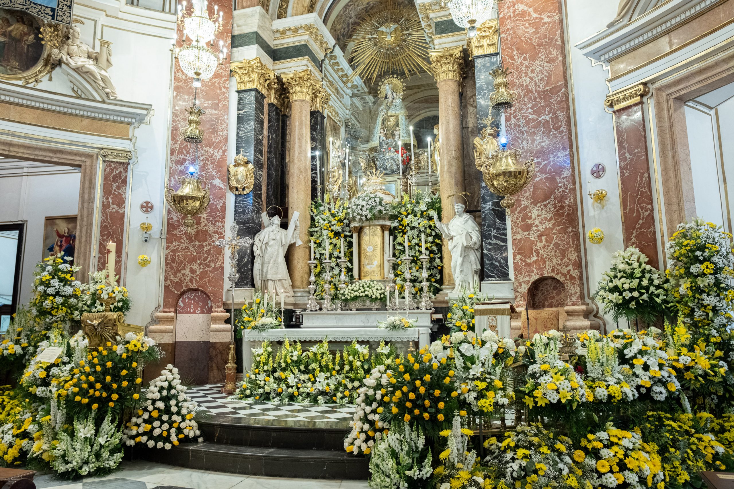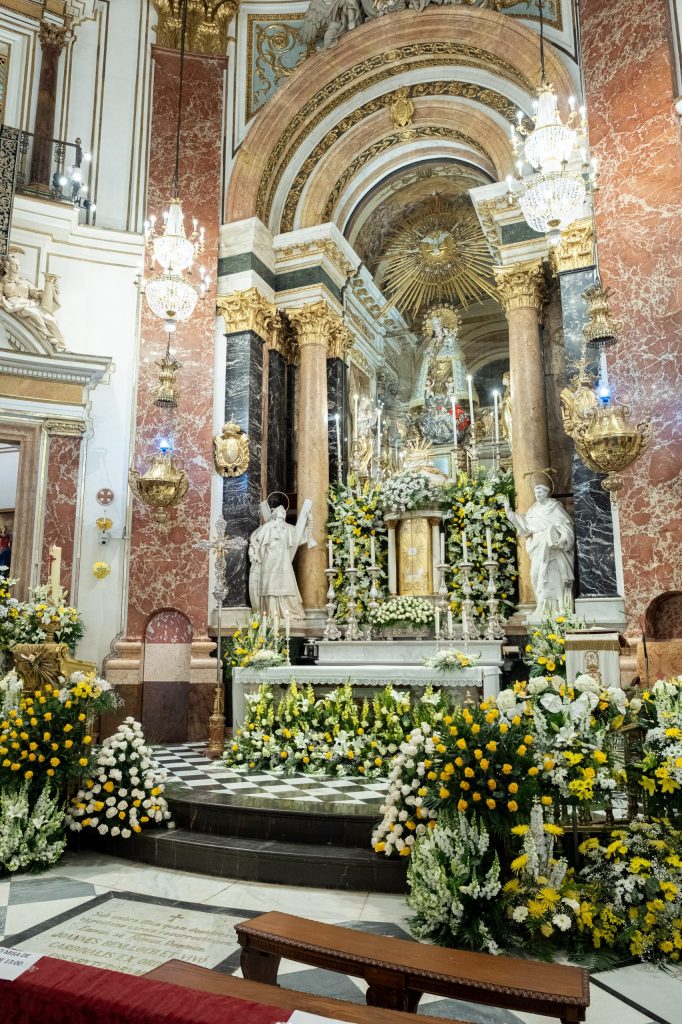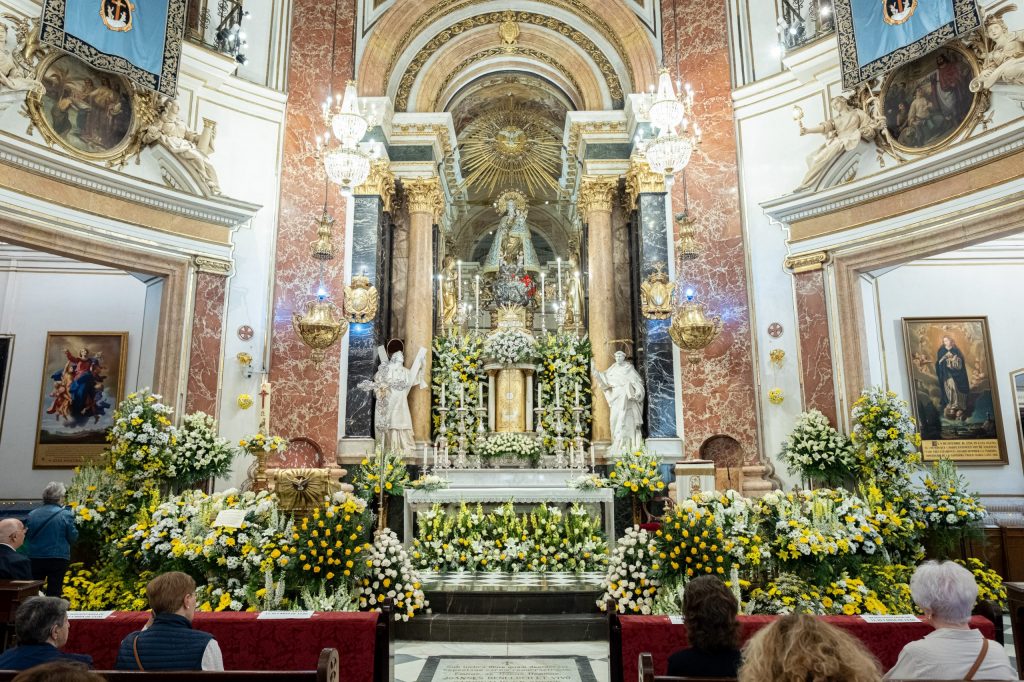 La tradicional “Festa dels Floristes” se celebra desde 1885 y con motivo de esta fiesta un grupo de representantes del gremio decoraron anoche el altar, las capillas, el presbiterio y el púlpito de la Basílica, para que esta mañana ya lucieran los ramos y arreglos florales donados por las propias floristerías y también por los floricultores.