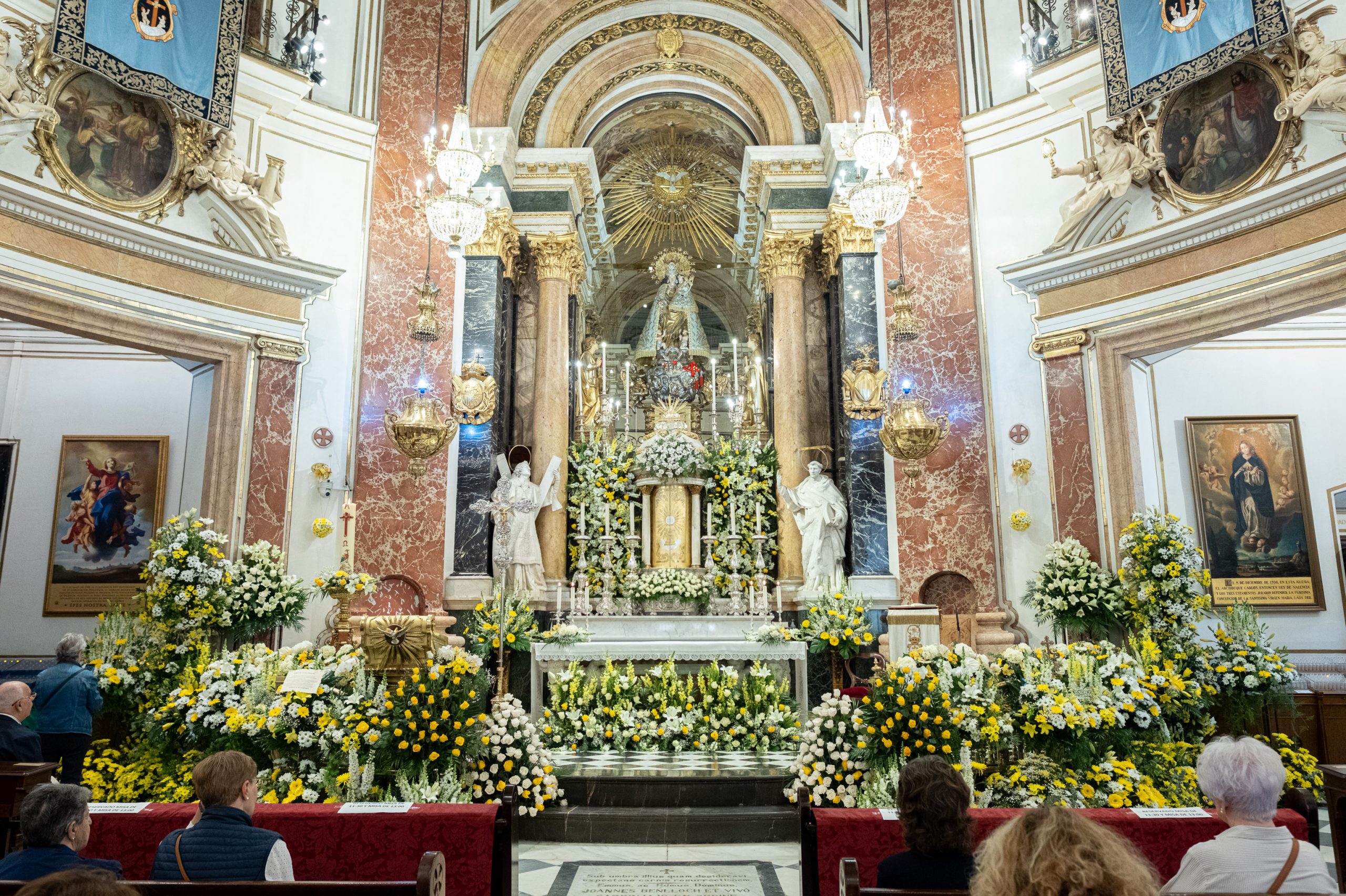 “Los floristas de Valencia a través de nuestro trabajo con las flores, que son las mejores transmisoras de sentimientos durante los eventos en la vida, dedicamos este exorno floral en toda la Basílica a la más maravillosa flor, a la mística azucena, a la rosa perfumada, a nuestra amada patrona, la Mare de Déu dels Desamparats”, tal y como señala el cartel instalado junto a la decoración.