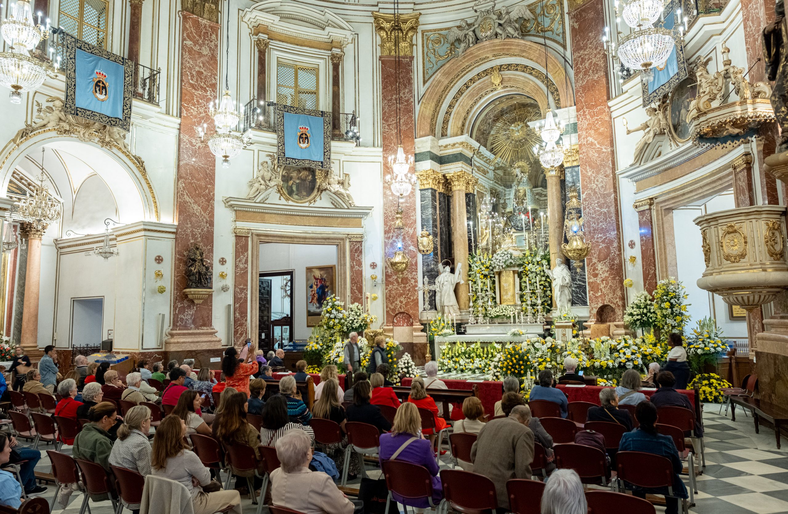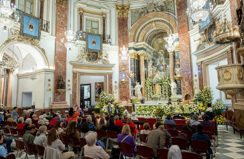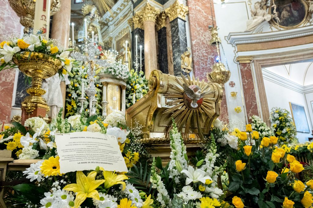 La Basílica de la Virgen de los Desamparados ha acogido hoy, jueves, la tradicional “Festa dels Floristes” con una misa a intención del gremio de floristas, cuyos miembros han decorado el templo con flores, en centros y arreglos florales.