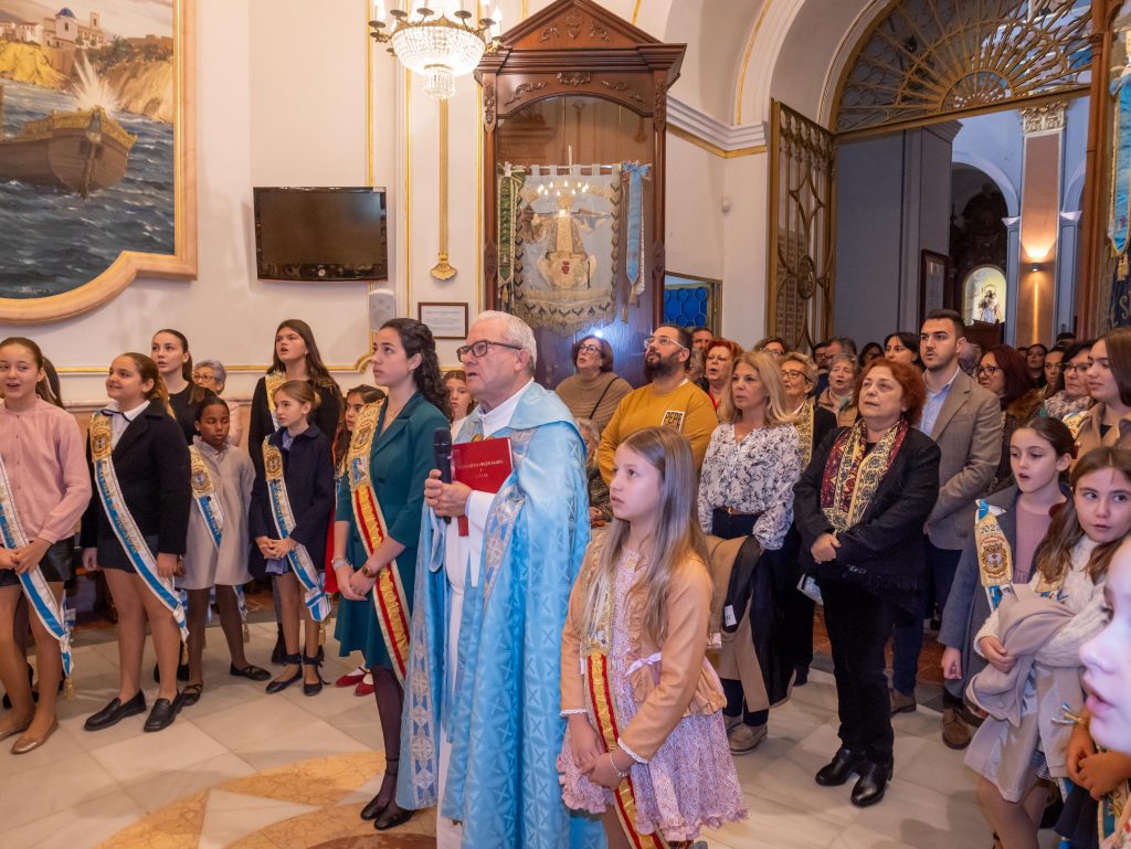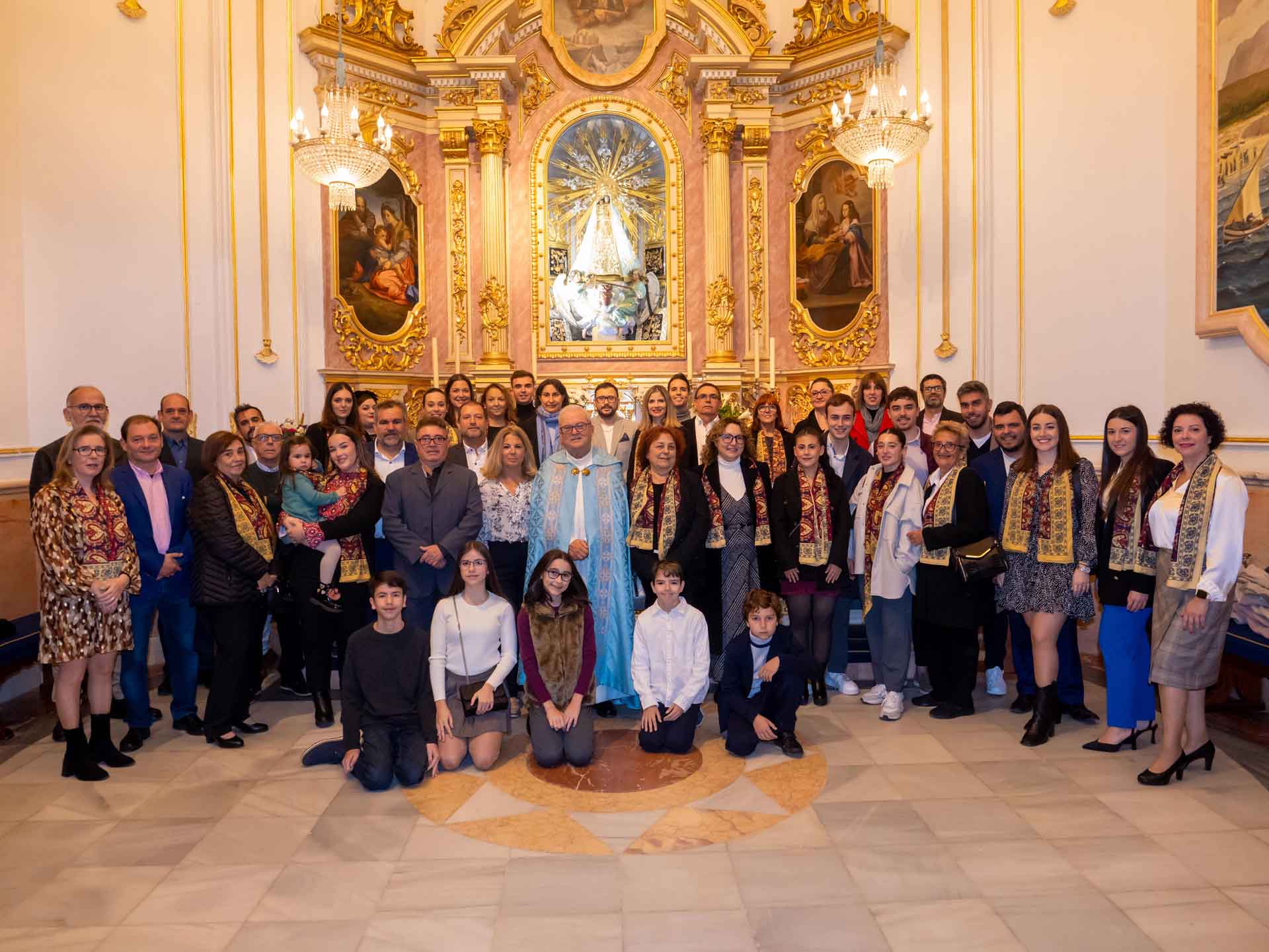 Mª Dolores Cano y la Comissió que preside, formada por más de 70 mayorales, han participado en el acto religioso que ha sido ofrecido por el cura párroco titular, Juan Antonio González y al que han asistido la concejal de Fiestas, Mariló Cebreros; las reinas Mayor e Infantil de 2023, Angélica Morenilla y Daniela Talavera junto a sus cortes de honor; y la Associació de Penyes ‘Verge del Sofratge’, representada por su nuevo presidente, Jaume Cortés.