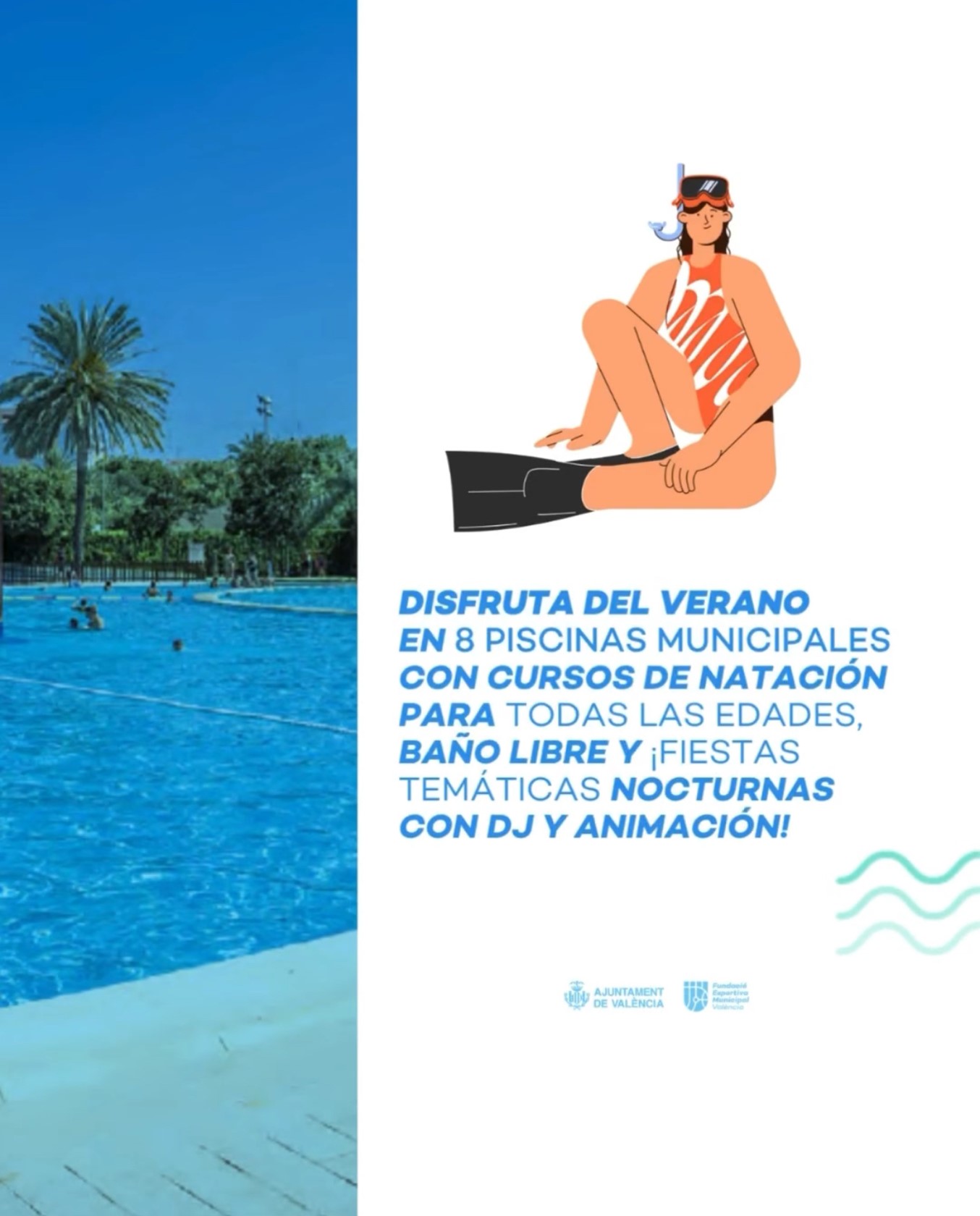 Para la temporada de verano de 2025 la ciudad cuenta con 8 instalaciones al aire libre: Benicalap, Benimàmet, Castellar‑l’Oliveral, El Palmar, La Hípica, Natzaret, Parque del Oeste y el polideportivo de Benimaclet. Cabe resaltar que todos los viernes por la noche llega “el baño nocturno” en el Parque del Oeste hasta la 1:00h.
