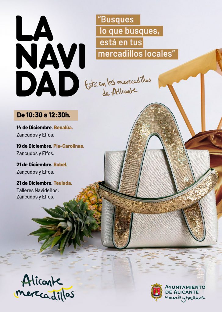 Así como esta mañana también se anunció la campaña de Navidad y el programa de actividades organizado por el Ayuntamiento de Alicante que por vez primera llega a los mercadillos, y tiene el lema ‘Busques lo que busques, está en tus mercadillos locales”, que incluye una serie de eventos y talleres diseñados para toda la familia, previsto del 14 al 21 de diciembre, de 10,30 a 12,30 horas.