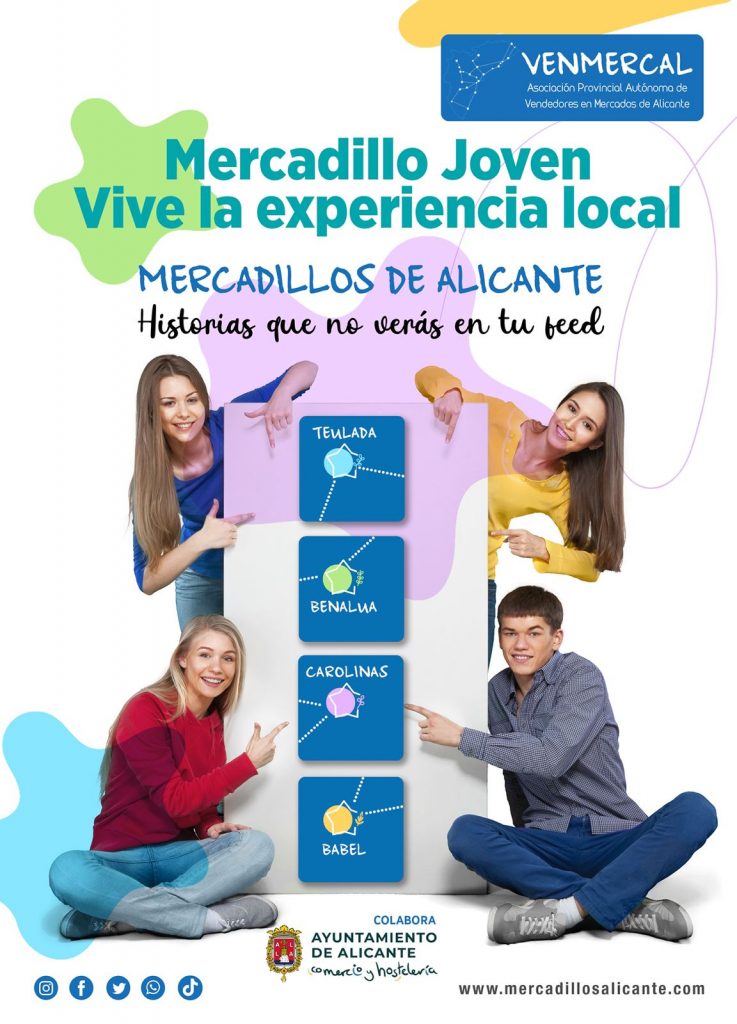 La concejalía de Mercados y Comercio del Ayuntamiento de Alicante y la Asociación provincial autónoma de Vendedores en Mercados de Alicante, VENMERCAL, han puesto en marcha la campaña ‘Mercadillo Joven. Vive la experiencia local’, creada con el objetivo de acercar los cuatro mercadillos a los jóvenes y revitalizar estos espacios comerciales tan emblemáticos de la ciudad, que son un referente para las compras de proximidad.