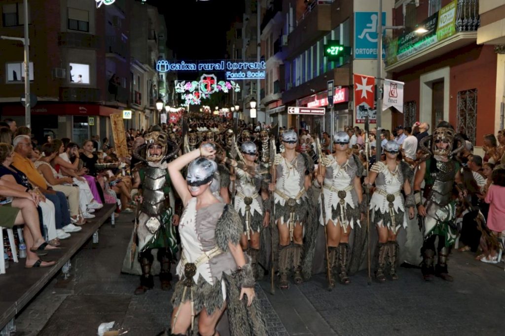 La Gran Entrada Mora y Cristiana de Torrent reunió en la noche del sábado a más de 12.000 personas para disfrutar del espectacular desfile de las 12 filaes y 12 comparsas de la ciudad desde la parroquia de Monte-Sión hasta el colegio Trinitarias, el cual estuvo marcado por la música festiva, el color, la tradición y la grandilocuencia de ambos bandos.