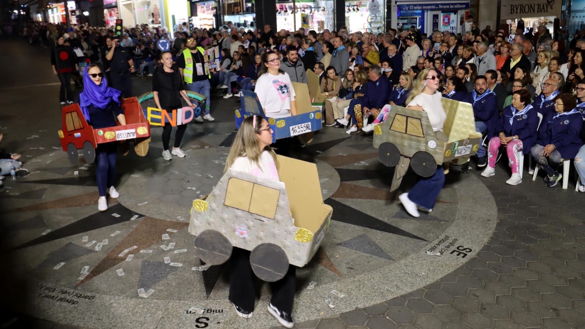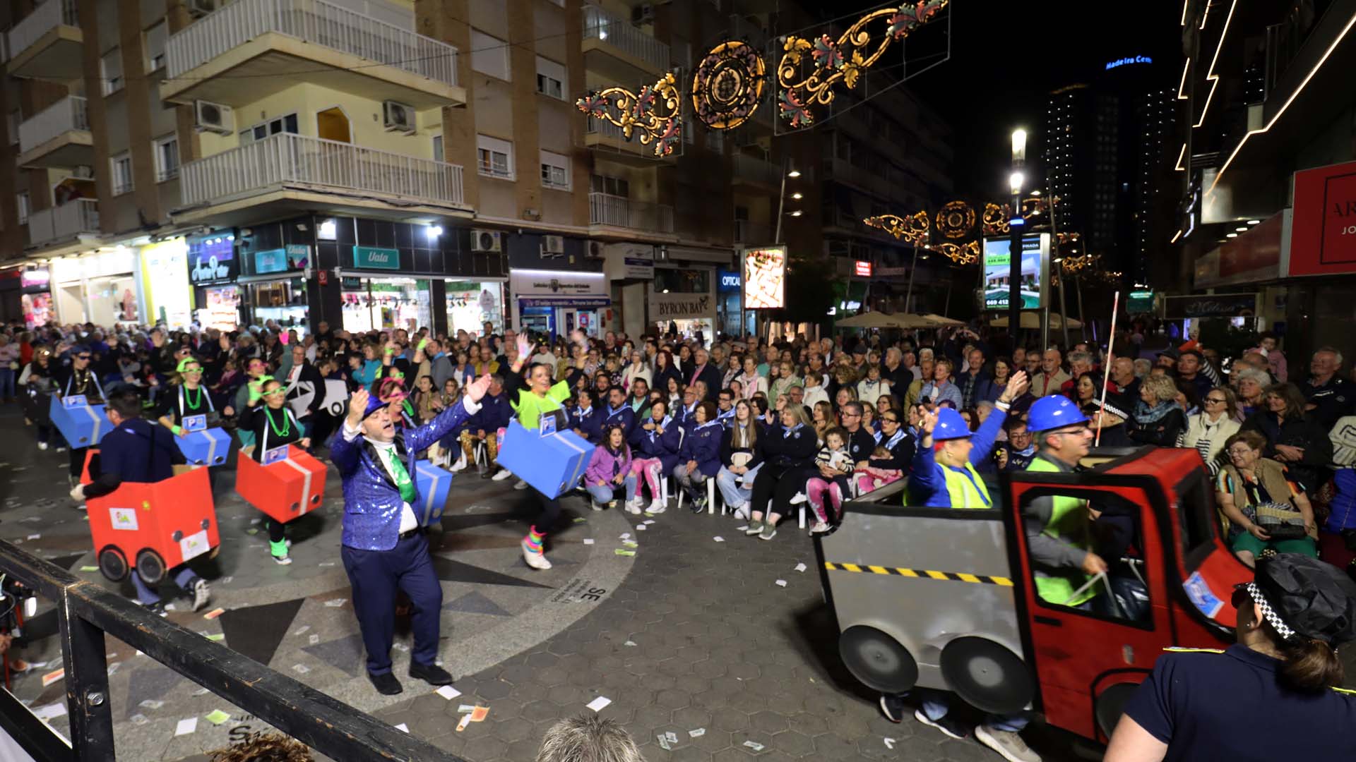 Los peñistas de Benidorm llenaron ayer las calles de crítica e ingenio en un vistoso y divertido Desfile del Humor, que recorrió las principales calles del centro y estuvo protagonizado por un total de nueve peñas. Organizado por la Associació de Penyes Verge del Sofratge, el acto arrancó poco después de las 19 horas y trancurrió con bastante agilidad debido a la decisión de la junta directiva del colectivo peñista, que preside Jonathan López, de eliminar tradicionales paradas que hasta ahora realizaban las peñas para escenificar sus actuaciones.