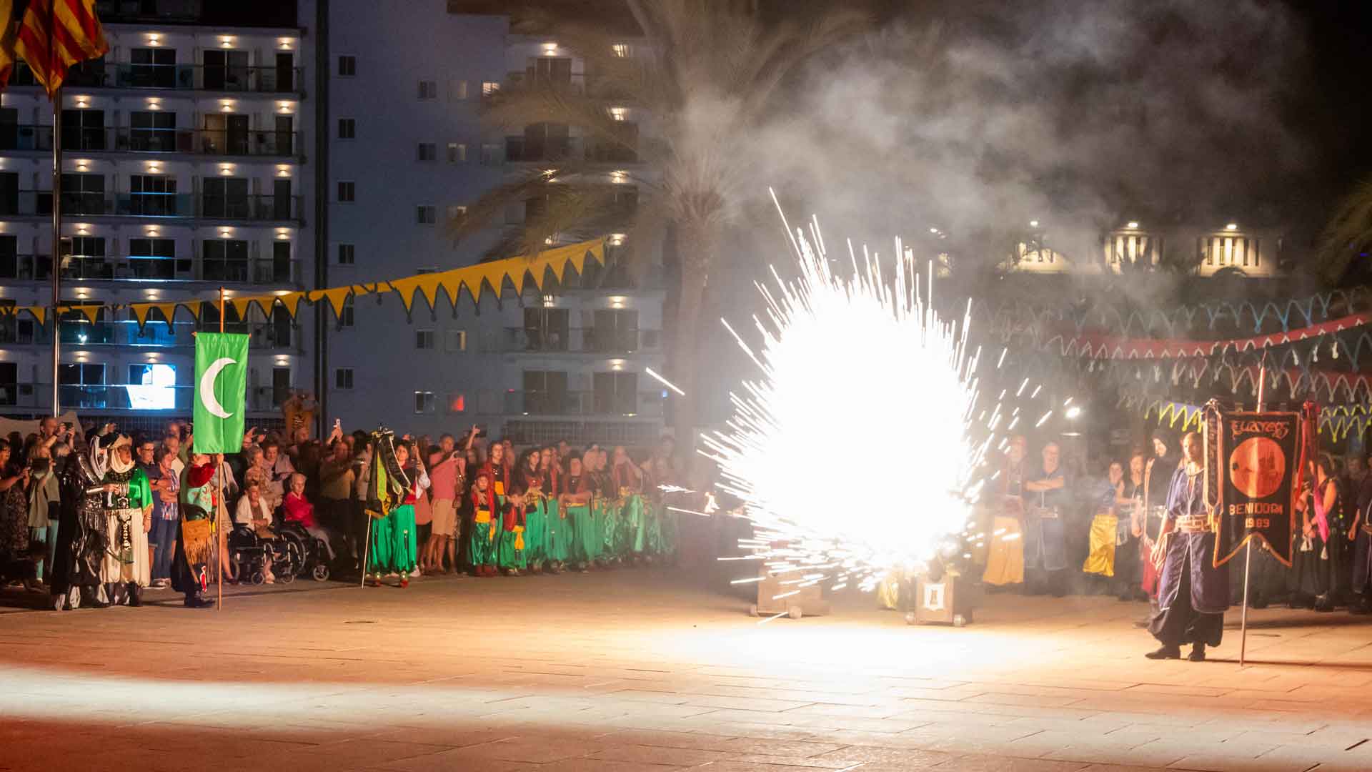 Las fiestas de Moros y Cristianos de Benidorm, declaradas de Interés Turístico Local, han dado comienzo esta pasada noche tras el desembarco de las huestes musulmanas en la ciudad y su posterior encuentro con las fuerzas cristianas en la plaza de SS. MM. los Reyes de España.