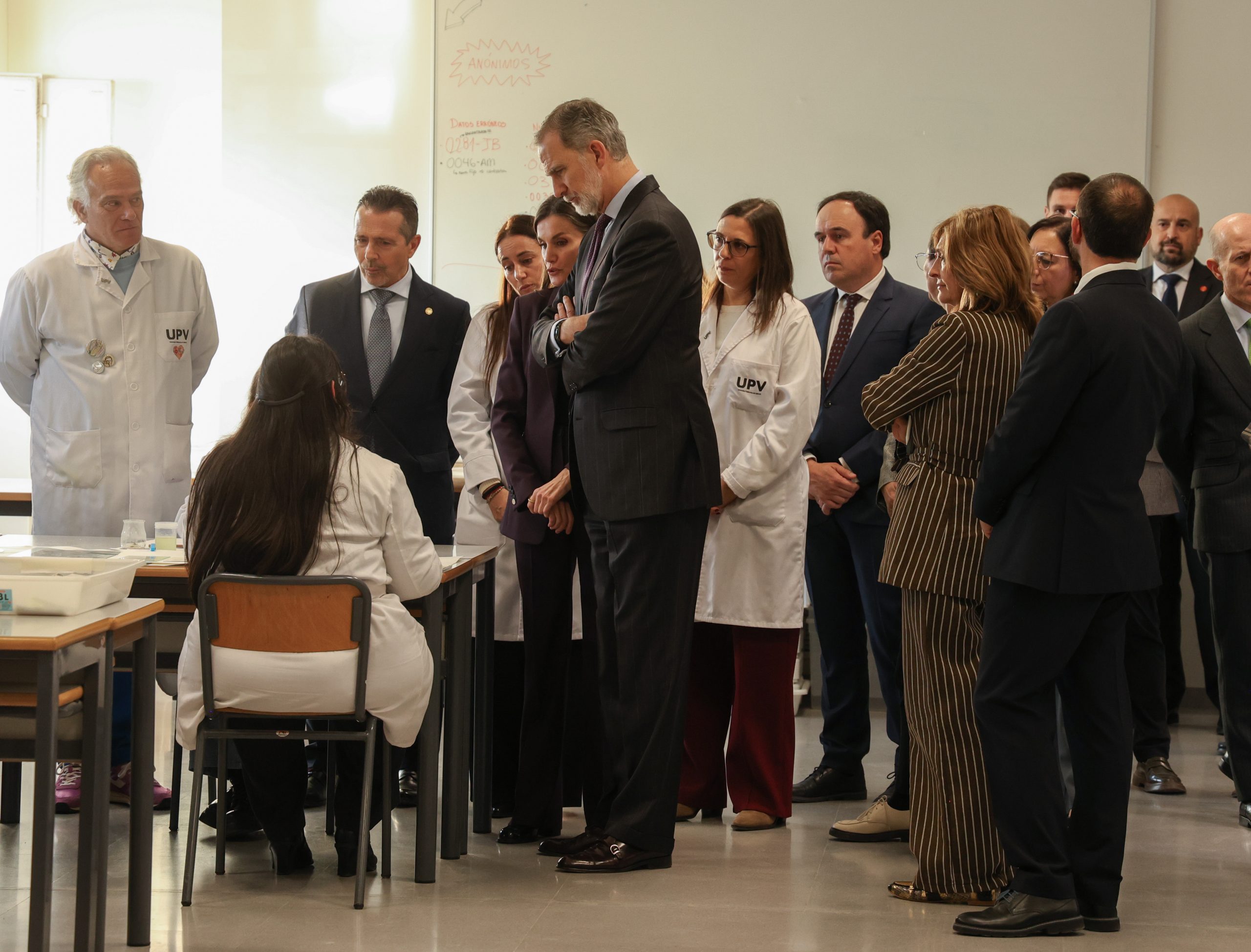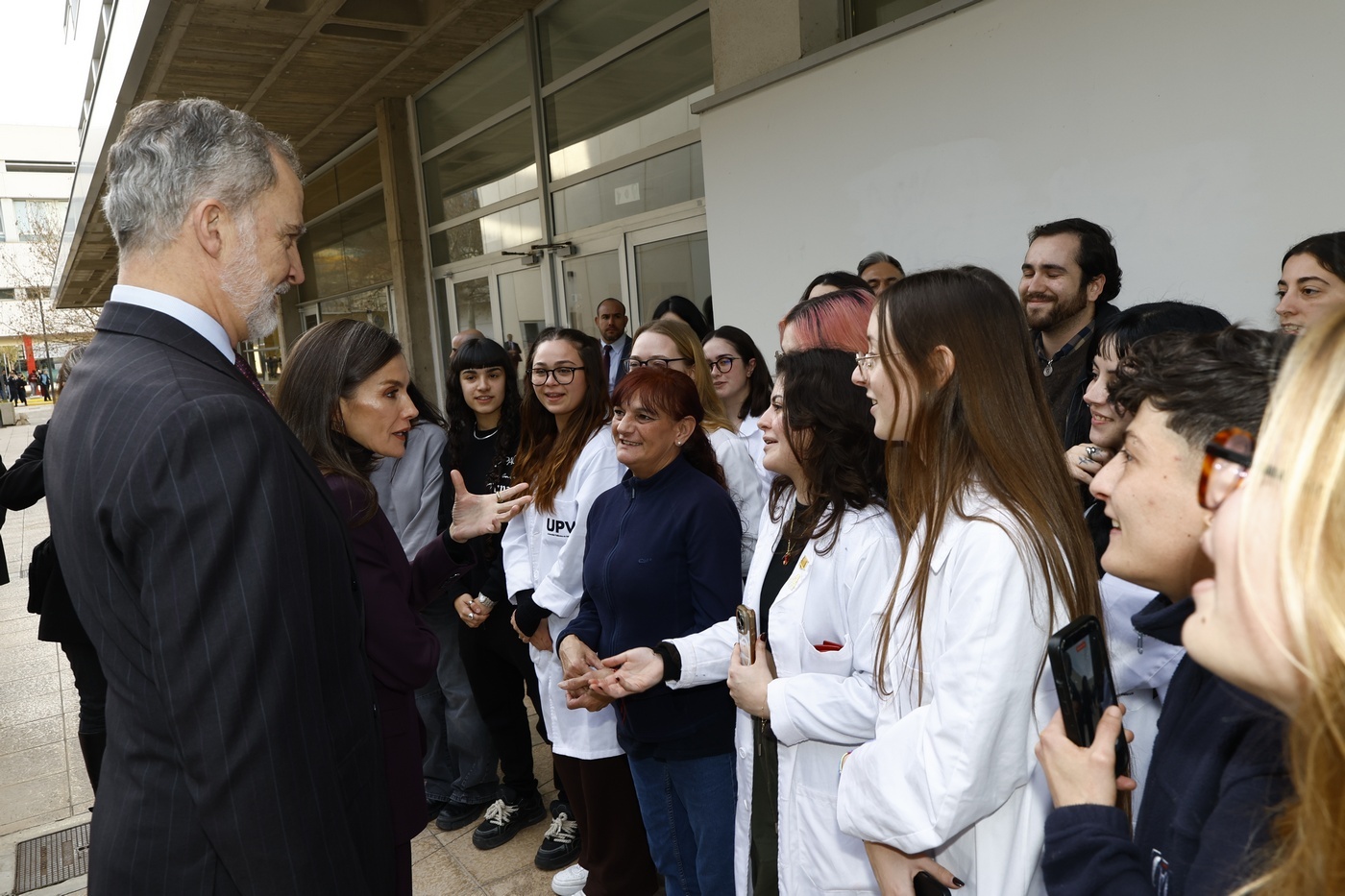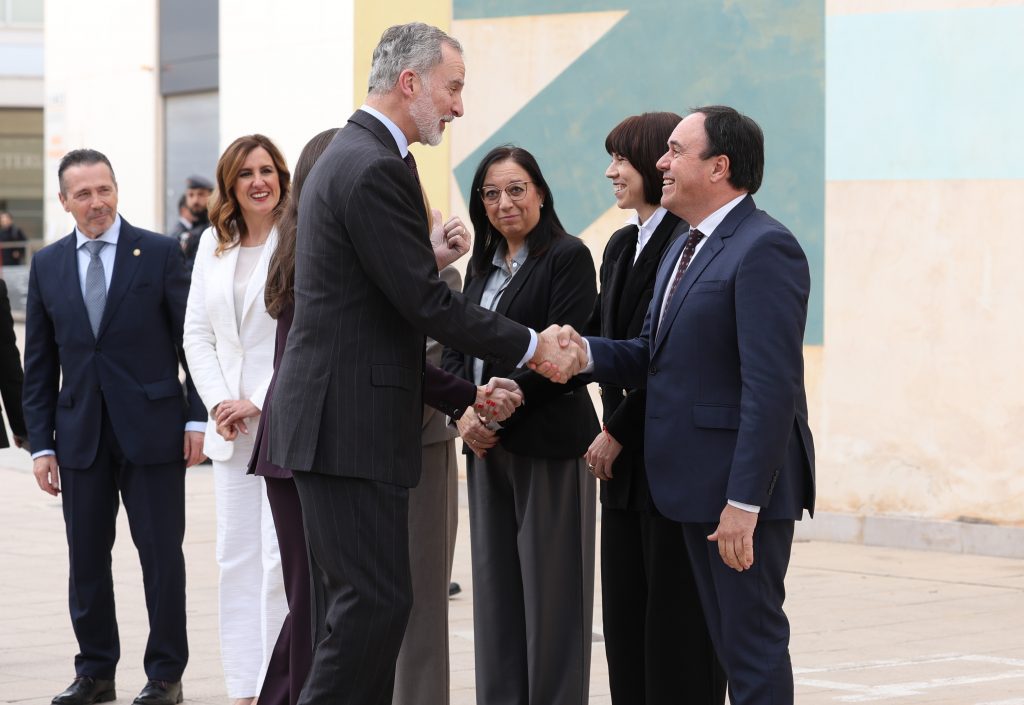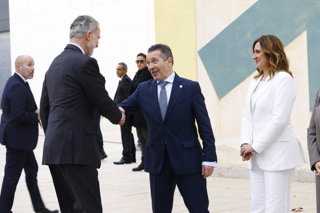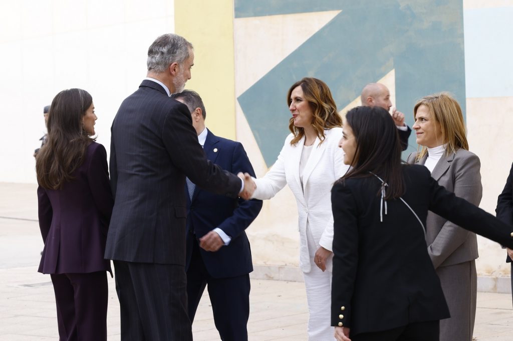 A su llegada a la facultad de Bellas Artes de la Universidad Politécnica de Valencia, Sus Majestades fueron recibidos por el presidente de la Generalitat Valenciana, Juan Francisco Pérez Llorca; la ministra de Ciencia, Innovación y Universidades, Diana Morant; la presidenta de Las Cortes Valencianas, María de los Llanos Massó; la delegada del Gobierno en la Comunidad Valenciana, Pilar Bernabé; la alcaldesa de Valencia, María José Catalá; y el rector de la Universidad Politécnica de Valencia, José Capilla.