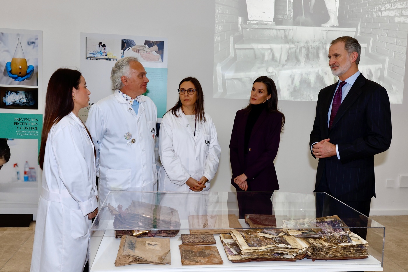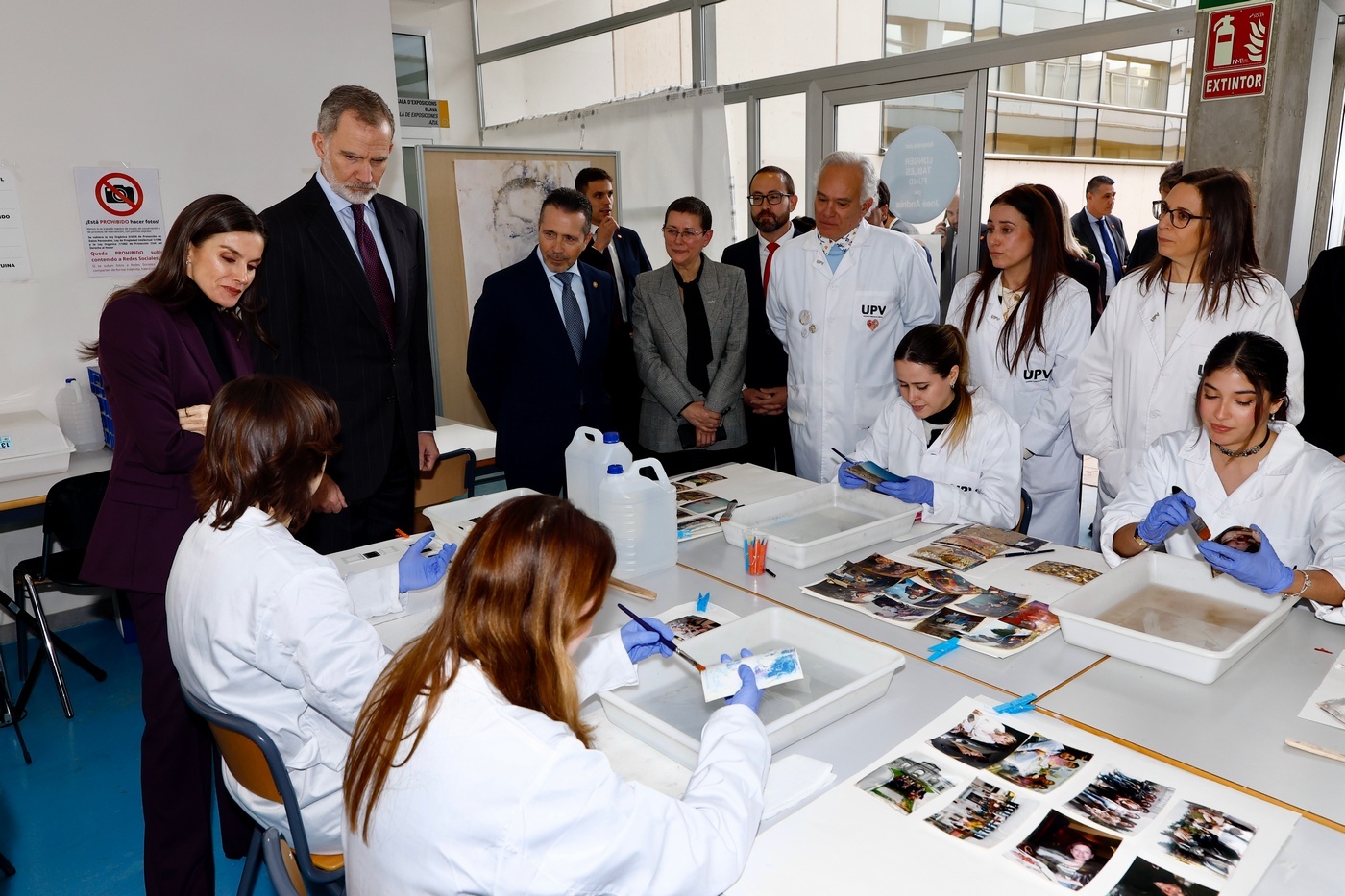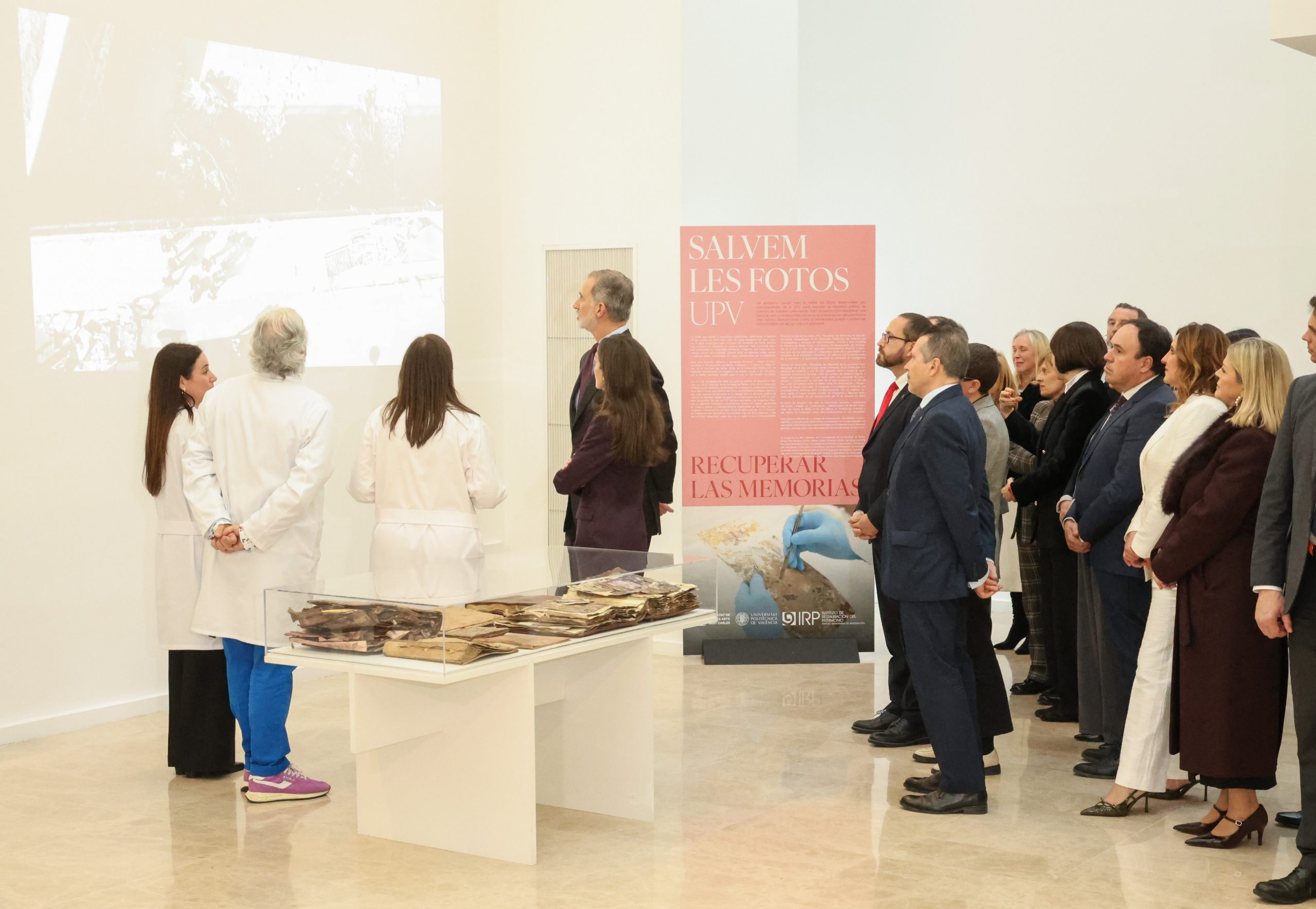 Tras los saludos, los Reyes comenzaron la visita a la exposición ubicada en la sala Josep Renau de la Facultad de Bellas Artes de la UPV, con explicaciones a cargo de los investigadores de la Universidad Politécnica de Valencia Esther Nebot Díaz, Pilar Soriano Sancho y Pedro Vicente-Mullor. Después visitaron el laboratorio donde trabaja el equipo de restauradores, que desde el 4 noviembre de 2024 ha intervenido 340.000 fotografías y ha trabajado con 3.000 álbumes de unas 400 familias.