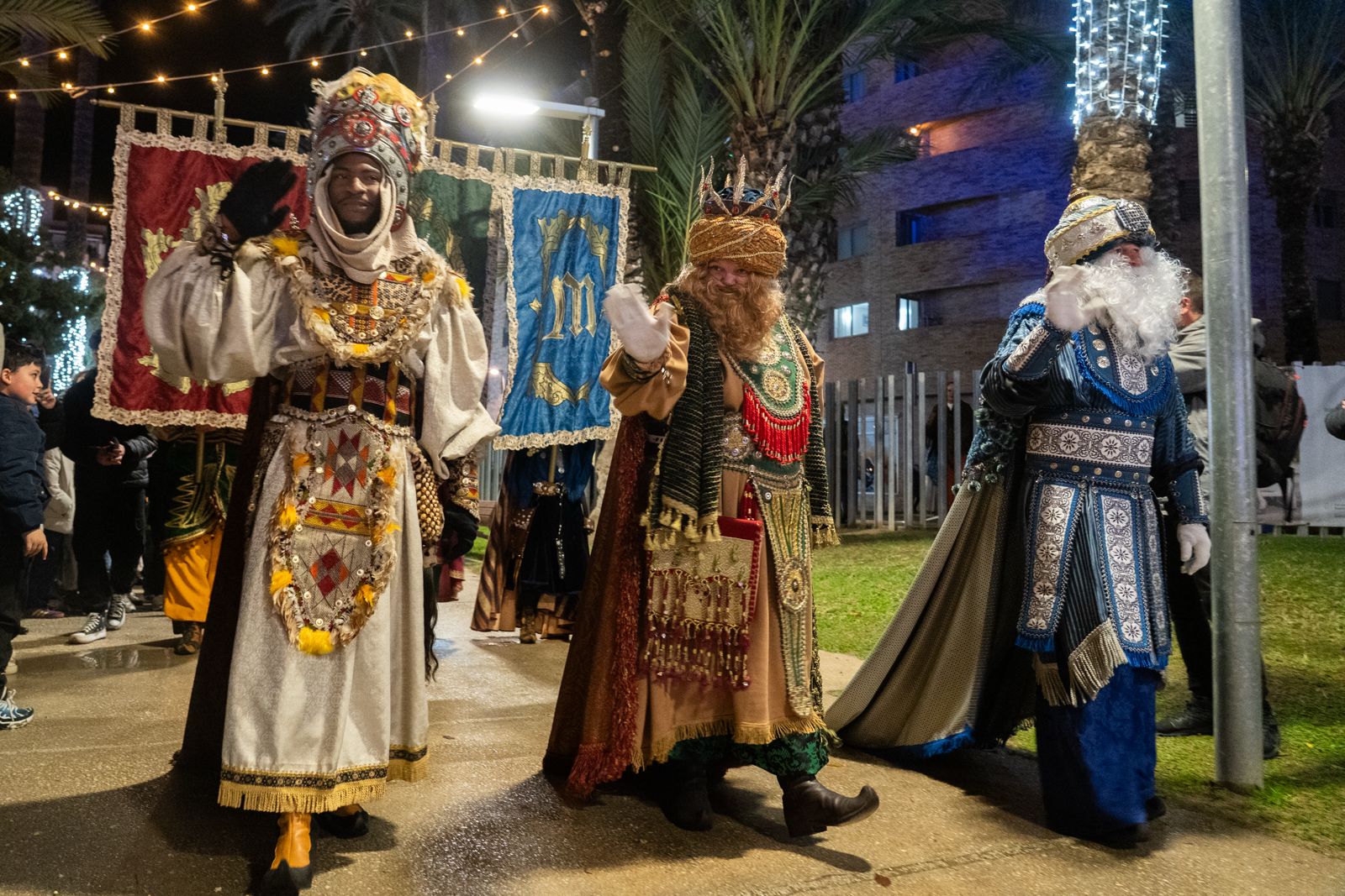 Niños y niñas mostraron su ilusión ante el paso de Melchor, Gaspar y Baltasar sobre sus camellos. Los Reyes desfilaban precedidos de sus abanderados y pajes reales, mientras saludaban al público. Las bandas de música de la Societat Ateneu Musical y la Agrupación Musical Mediterráneo acompañaban a Sus Majestades junto a las compañías de ballets locales, Danza Evi Ruiz, Tribalia Danza y Yabai Dance Estudio.