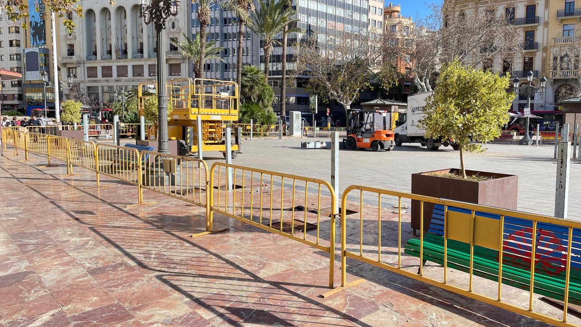 Toda la movilización ha contado con un equipo humano integrado por entre 14 y 25 personas (en función de los distintos eventos) en exteriores. Entre las diversas tareas que se han acometido durante el periodo festivo, destacan los trabajos en torno a las actividades programadas en la plaza del Ayuntamiento: el montaje de la valla de protección (jaula) para las mascletaes, el montaje de la estructura de protección del balcón principal y balcones colindantes, la instalación de postes para facilitar el tendido de cableado, la instalación de postes de indicación de las empresas pirotécnicas que realizan el disparo y elaboración de los carteles señalizadores y el montaje de la tarima para la prensa gráfica en la terraza de la casa consistorial