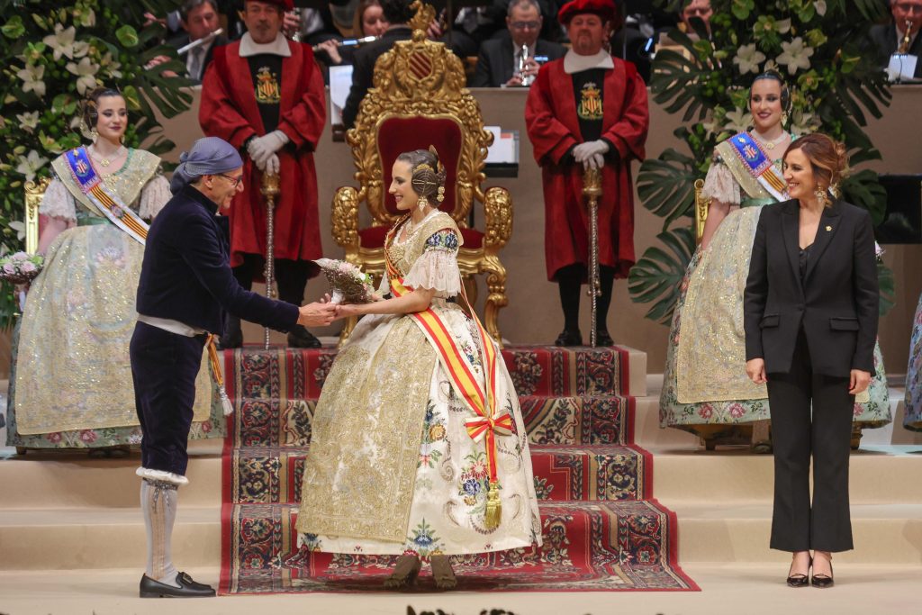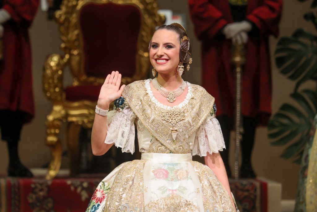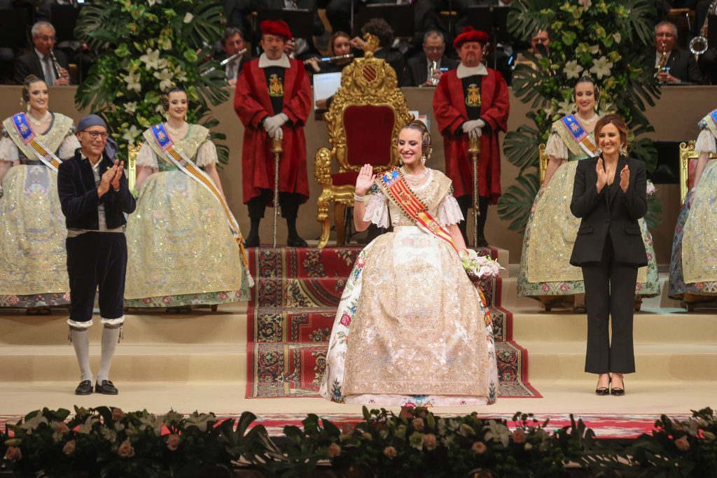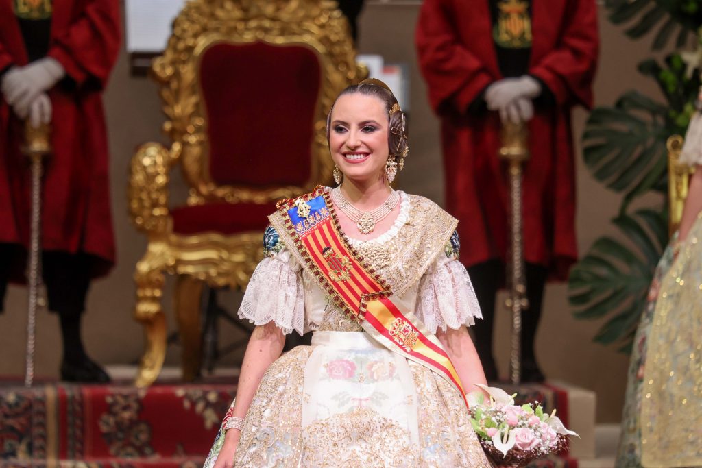 Lluint amb elegància el seu espolí Fallera Major de València, de color Blanco Madreperla confeccionat per La Joia Indumentaristas, hem pogut contemplar la emoció en la lluentor dels seus ulls i la immensa felicitat amb el seu bonic somriure, mentre desfilava per la Sala Iturbi fins arribar dalt de l’escenari on la esperaven en peu la seua Cort d’Honor i l’alcaldessa de la ciutat, María José Catalá, per a rebre-la com es mereix.