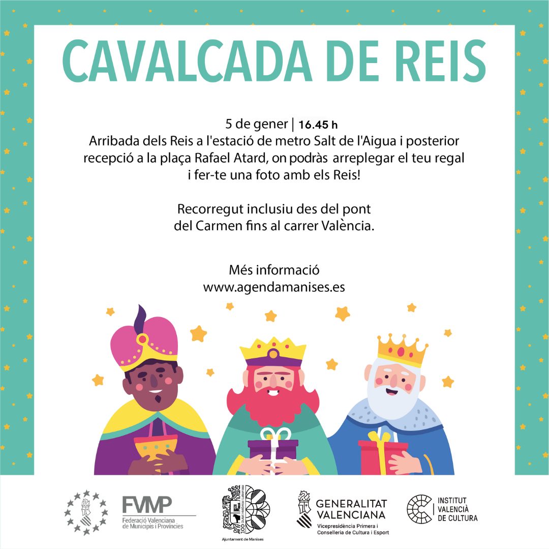 Los Reyes de Oriente llegarán a la estación de metro Salt de l’Aigua, a las 16:45 horas, donde serán recibidos por la música de la Sociedad Musical La Artística Manisense, la corporación municipal y representantes de colectivos participantes. Posteriormente, después del recorrido, tendrán una recepción en la plaza Rafael Atard, donde los niños y las niñas del municipio podrán recoger su regalo, además de hacerse una foto con Melchor, Gaspar y Baltasar.