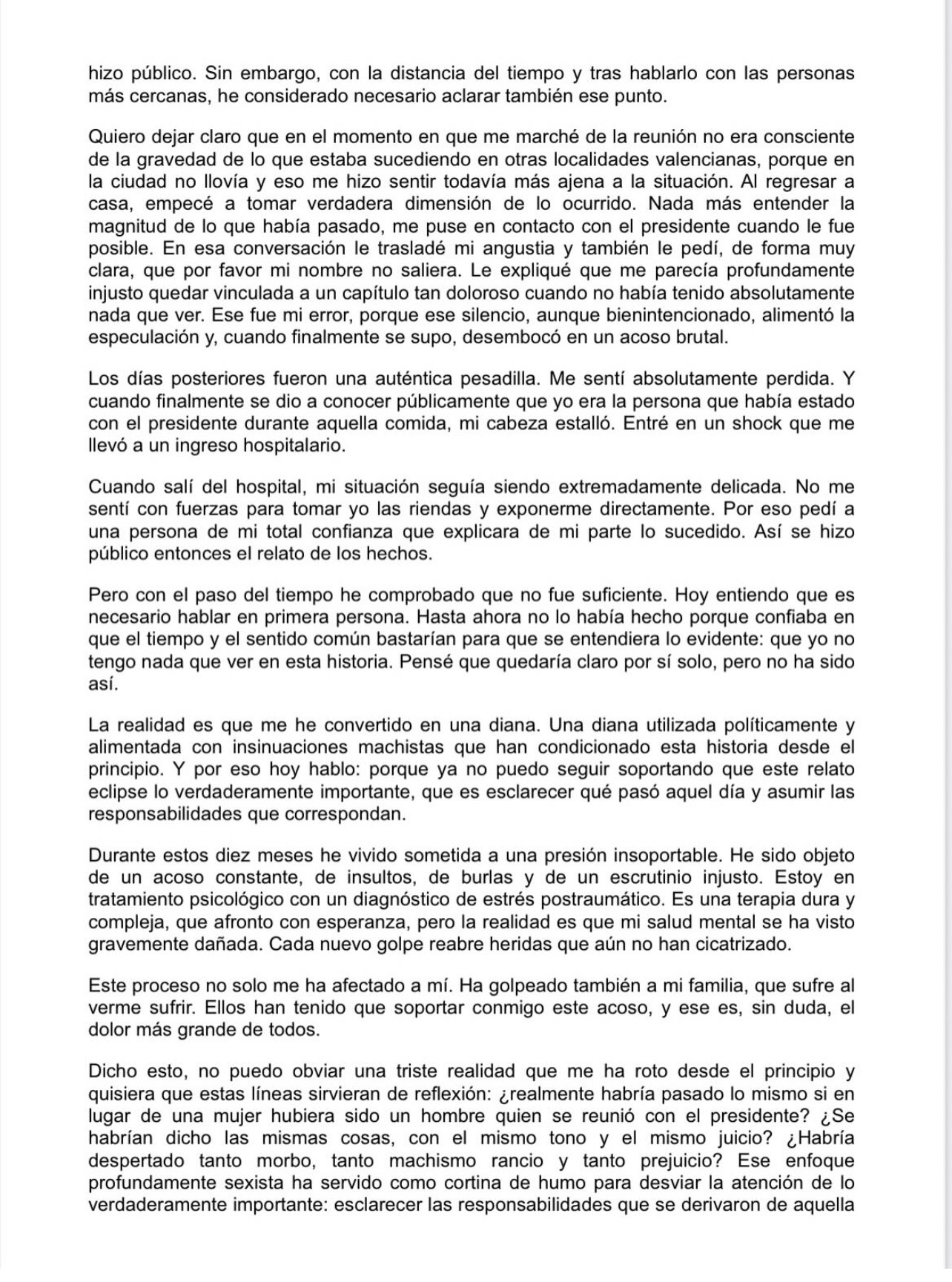 Quiero dejar claro que en el momento en que me marché de la reunión no era consciente de la gravedad de lo que estaba sucediendo en otras localidades valencianas, porque en la ciudad no llovía y eso me hizo sentir todavía más ajena a la situación. Al regresar a casa, empecé a tomar verdadera dimensión de lo ocurrido. Nada más entender la magnitud de lo que había pasado, me puse en contacto con el presidente cuando le fue posible. En esa conversación le trasladé mi angustia y también le pedí, de forma muy clara, que por favor mi nombre no saliera. Le expliqué que me parecía profundamente injusto quedar vinculada a un capítulo tan doloroso cuando no había tenido absolutamente nada que ver. Ese fue mi error, porque ese silencio, aunque bienintencionado, alimentó la especulación y, cuando finalmente se supo, desembocó en un acoso brutal.