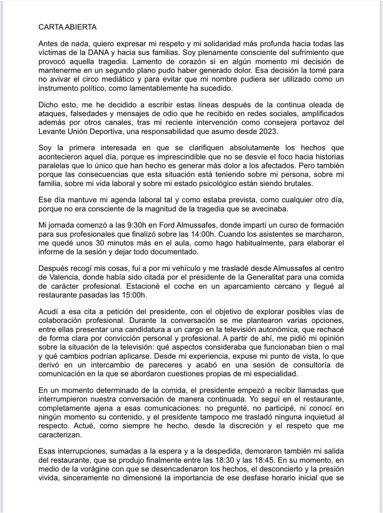 Vilaplana asegura que tomó la decisión de mantenerse en silencio para “no avivar el circo mediático” y evitar que su nombre pudiese ser utilizado como un instrumento político, “como lamentablemente ha pasado”. En este sentido, en la carta ha detallado qué hizo el 29 de octubre de 2024, comenzando por su impartición de un curso en Ford Almussafes a las 09.30 horas, llegando al restaurante El Ventorro pasadas las 15:00 horas y saliendo de allí “entre las 18.30 y las 18:45 horas”, ajena a lo que estaba ocurriendo.