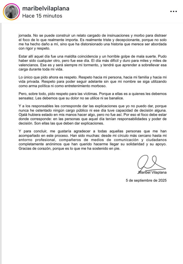Para Vilaplana, “estar allí aquel día fue una maldita coincidencia y un horrible golpe de mala suerte”. Por ello, ha pedido respeto a su persona y a su familia y ha expresado su respeto hacia las víctimas de la dana, “porque es a ellas a quienes les debemos sensatez”. “Por eso el foco debe estar donde corresponde: en las personas que aquel día tenían responsabilidades y poder de decisión. Son ellas las que deben dar explicaciones”, ha sentenciado la periodista.