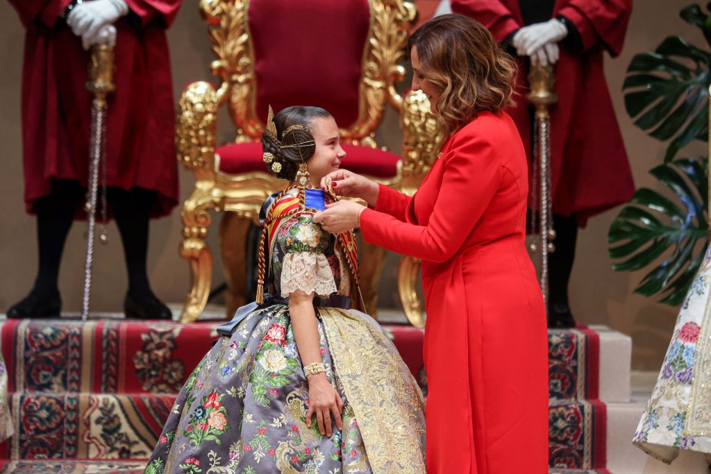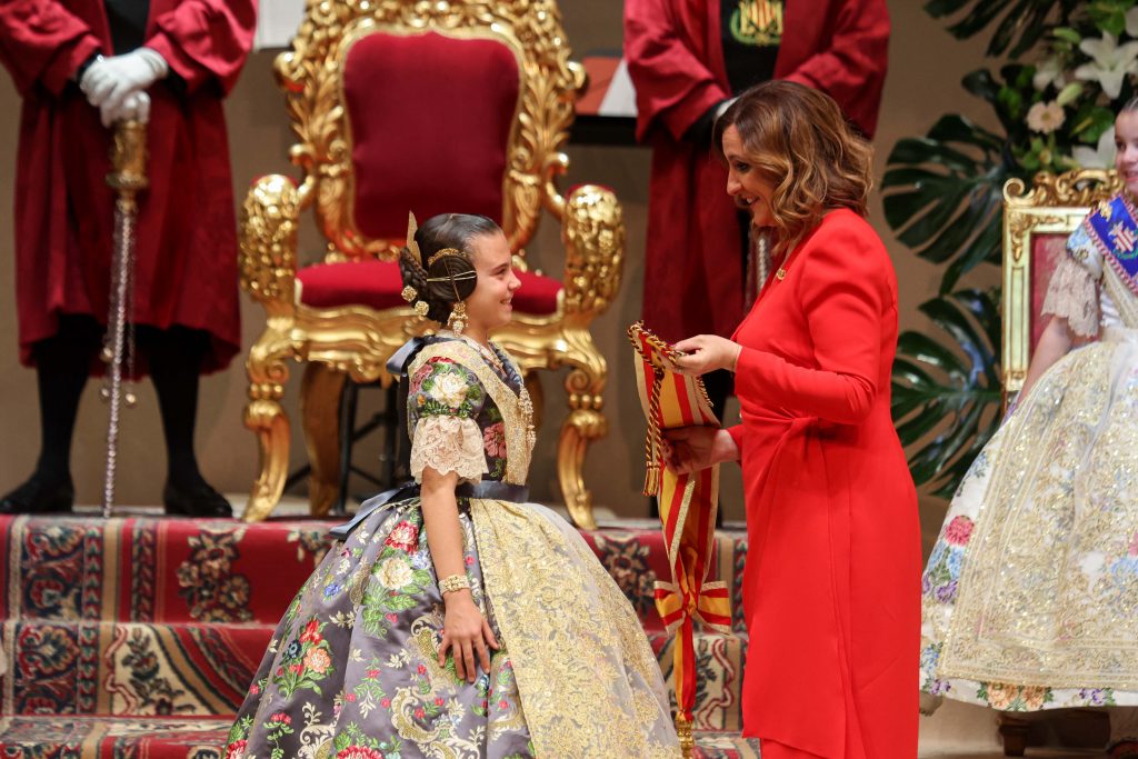 Després de saludar al món faller allí present, Marina rebia la banda i la joia que l’acrediten com a Fallera Major Infantil de València. Un moment molt especial, ja que han sigut els seus germans, Claudia i Lucas García Arribas, els encarregats d’entregar en mans de l’alcaldessa i el regidor estos reconeixements.