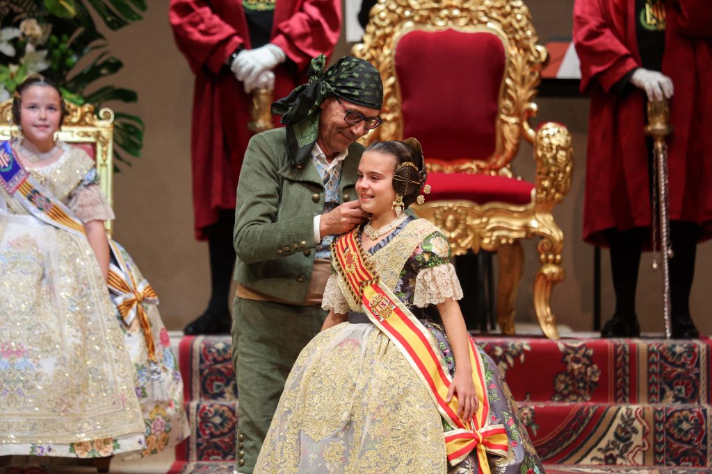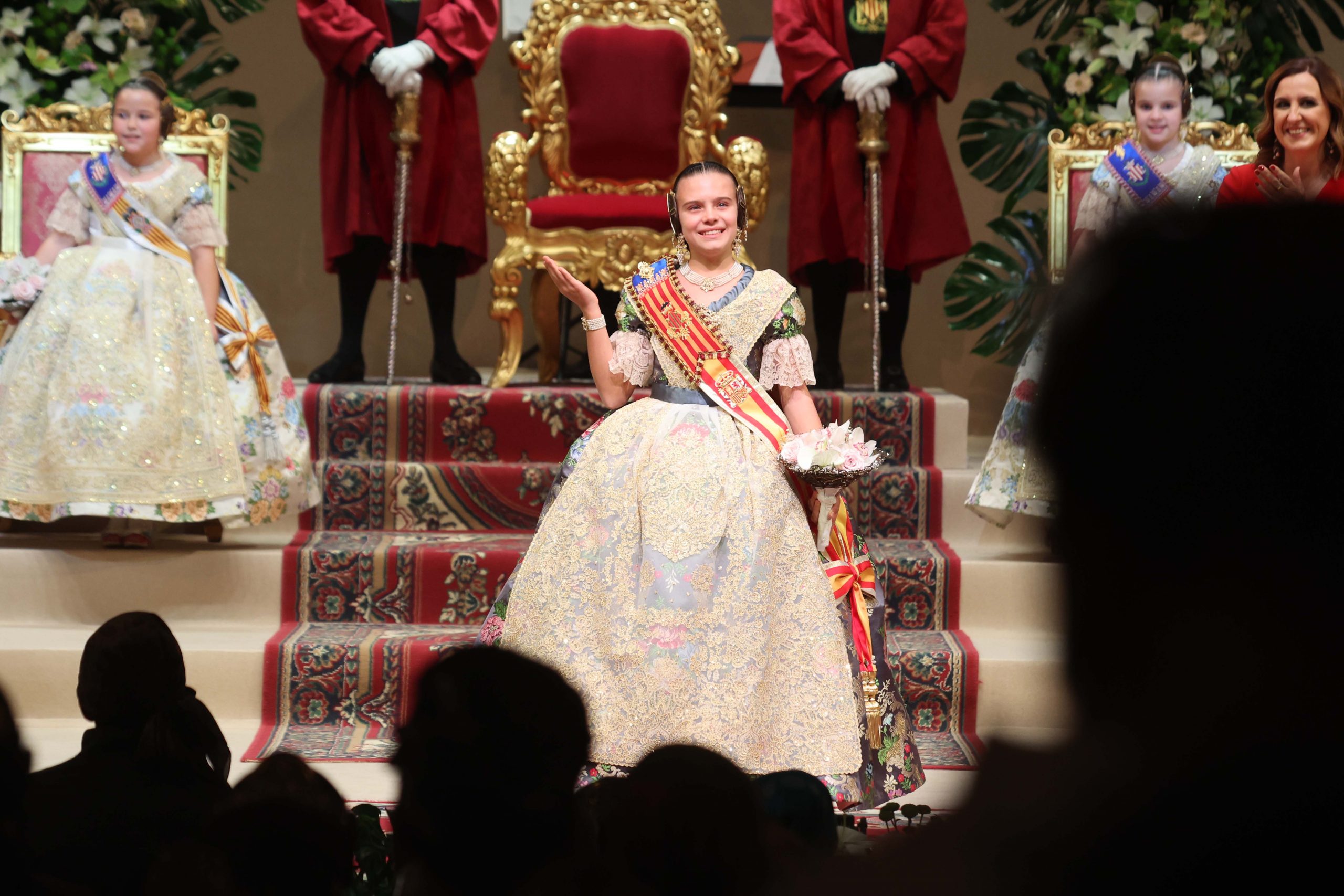 Els aplaudiments de familiars, amics, autoritats, falleres majors infantils i presidents infantils de totes les comissions de la ciutat envaïen el saló davant l’emoció de Marina, que brillava més que mai. En l’escenari l’esperaven la seua Cort d’Honor i el regidor de Cultura Festiva, Santiago Ballester.