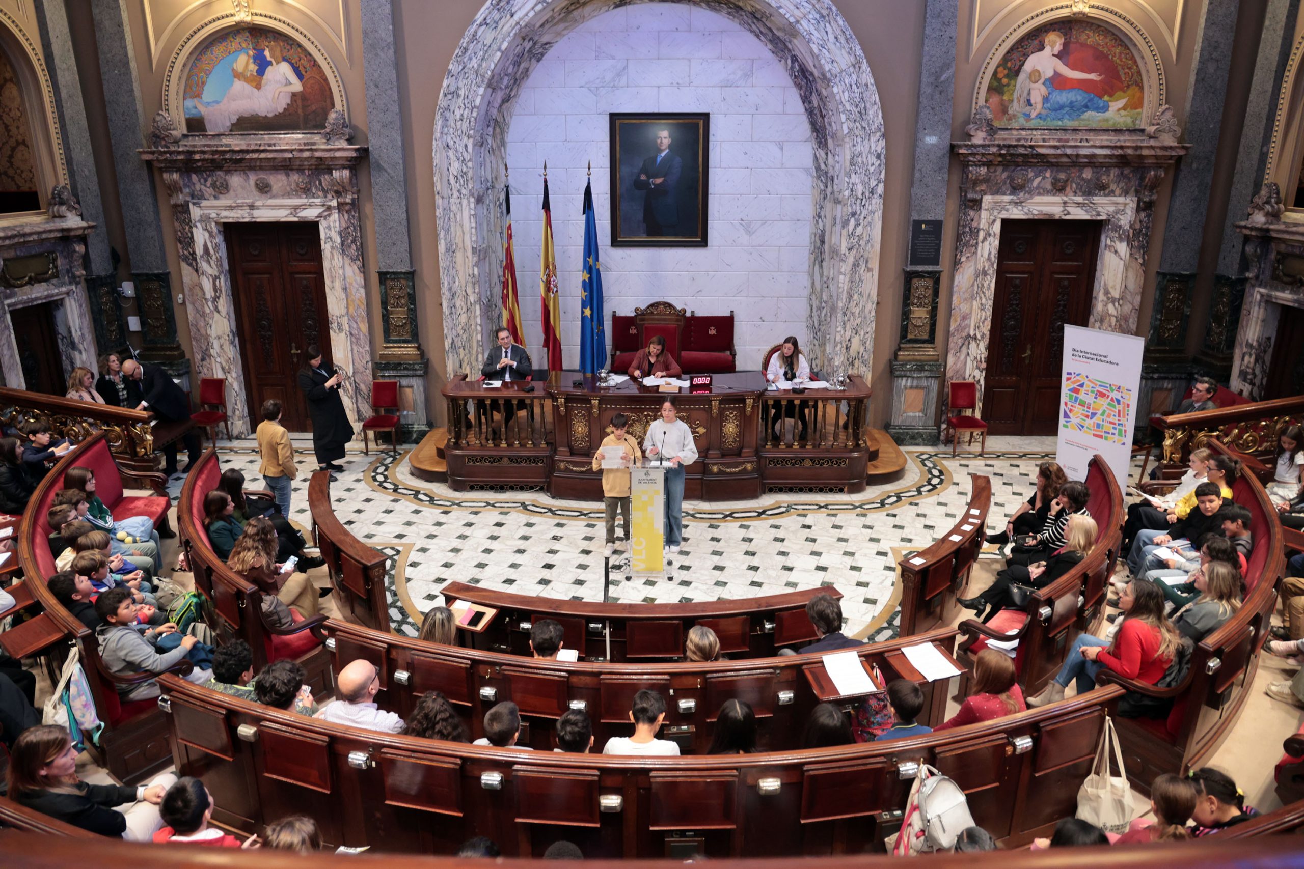 Más de 120 alumnas y alumnos de Primaria de los colegios CEIP Antonio García López, CEIP Sector Aéreo y CEIP Pinedo han llevado sus propuestas al Hemiciclo del Ayuntamiento en una nueva edición del Pleno Infantil, que se ha reunido este viernes en las dependencias municipales en el marco del Día Internacional de la Ciudad Educadora, que se celebra cada 30 de noviembre, y que este año lleva por lema “La Ciudad Educadora como laboratorio de aprendizajes, ciudadanía y transformación social”. La alcaldesa de València, María José Catalá, ha presidido esta sesión especial, en la que varios niños y niñas, representantes de sus compañeros y compañeras de aula en los tres colegios participantes han intervenido y han planteado sus inquietudes, iniciativas y preguntas a los miembros del equipo de gobierno local.
