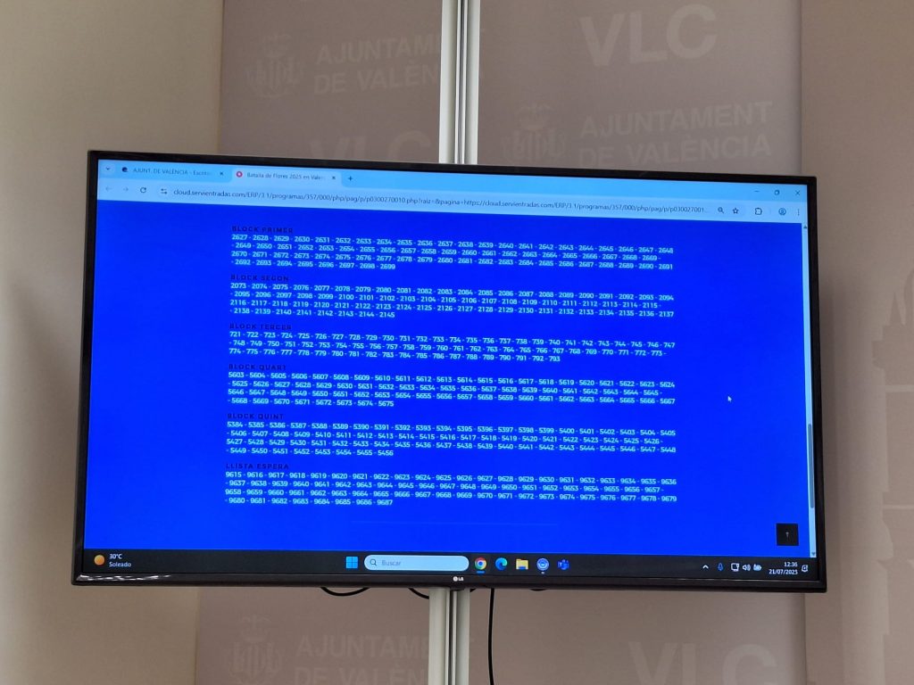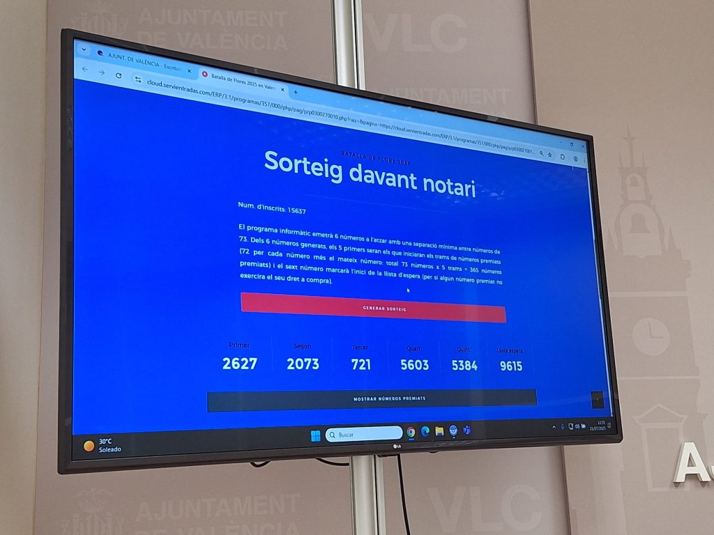 Más de 15.600 personas, casi 1.000 más que el año pasado, han participado este lunes en el sorteo de los palcos para la Batalla de Flores 2025, en el marco de la Gran Feria de València. El concejal de Fallas, Santiago Ballester, ha presidido el sorteo, que ha contado con la presencia del notario José Manuel Fuertes, de la Notaría Fuertes Vidal, y con la asistencia técnica de la empresa Kalu Universal Ticket.