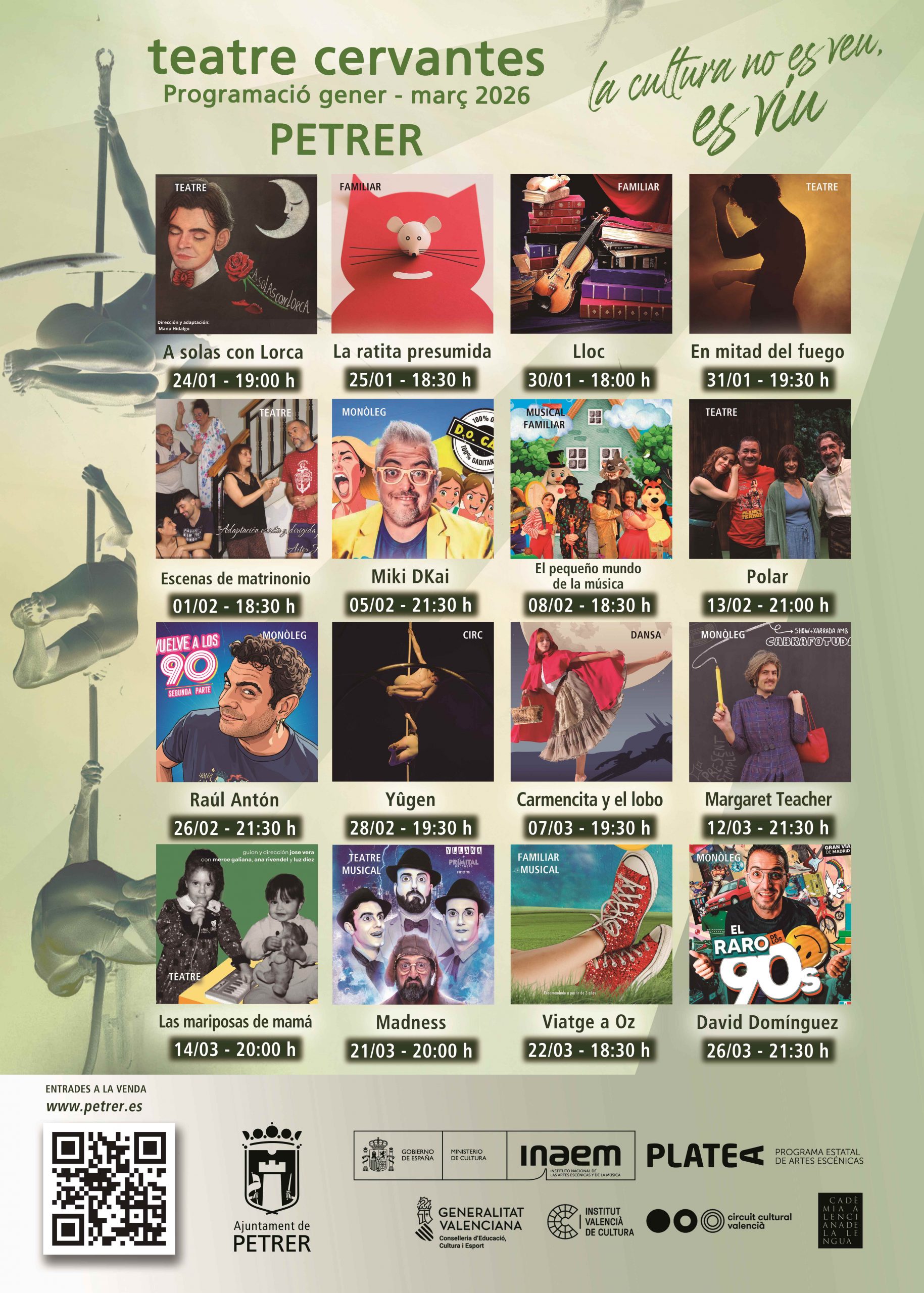 Para la nueva temporada, el Teatro Cervantes ofrece un abono que incluye cuatro de los principales espectáculos, todos ellos de PLATEA: En mitad de tanto fuego, Polar, Carmencita y el Lobo y Madness. El abono tiene un coste de 40 € (10 € por espectáculo) y se puede adquirir, hasta finales de enero, en https://petrer.es/events/2026-01-31-venta-de-abonos-teatro-cervantes/ o, presencialmente, en la taquilla del teatro, los martes y jueves de 18:00 a 20:00 horas. También el resto de entradas.