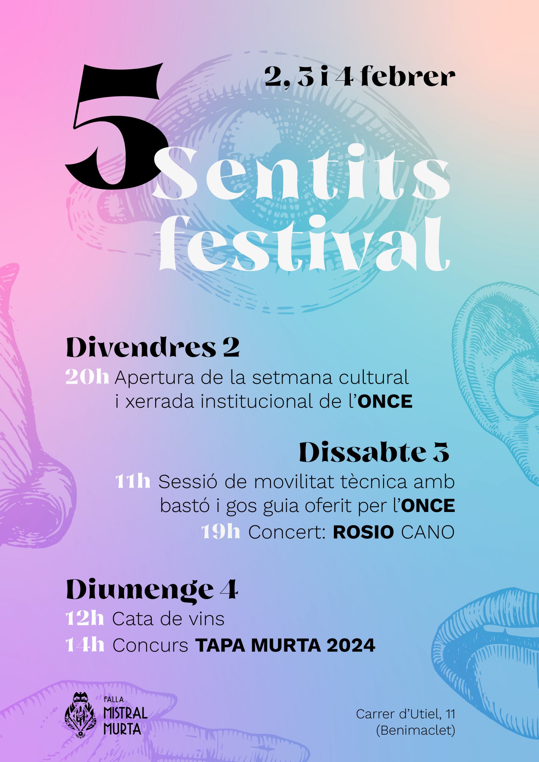 . La Asociación Cultural Falla Mistral Murta ha celebrado este fin de semana el 5 Sentits Festival, un evento que organizaba por primera vez y que ha contado con la participación de más de 200 personas en alguna de las actividades culturales y artísticas que han tenido lugar durante todo el fin de semana.