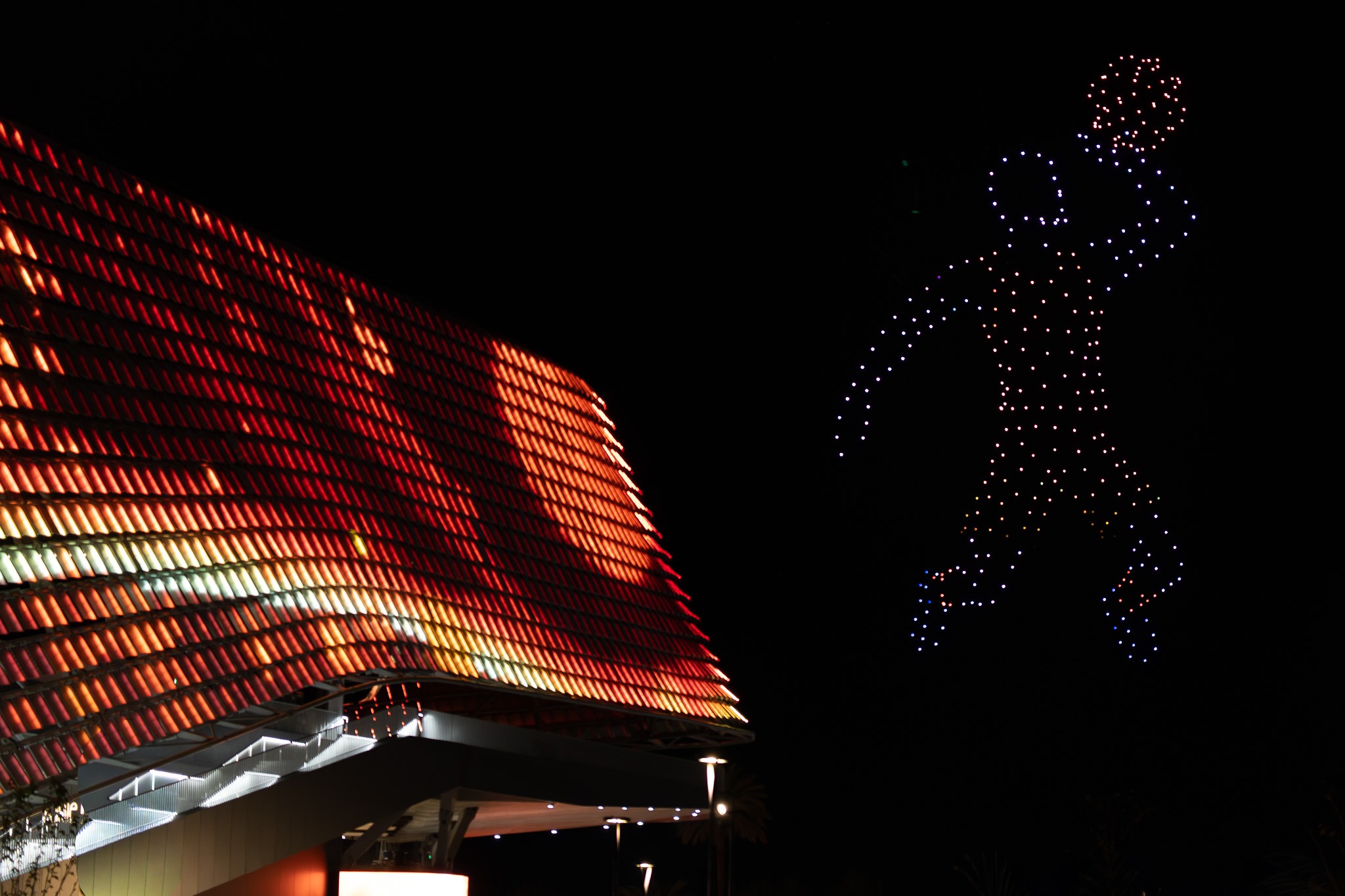 Los asistentes pudieron visualizar desde la explanada peatonal situada en la calle Ángel Villena la combinación de imágenes de los 350 drones que participaron en el espectáculo junto a las que se creaban en la fachada videoiluminada y el “Ojo” (la gran pantalla exterior de 300 metros cuadrados) del recinto.