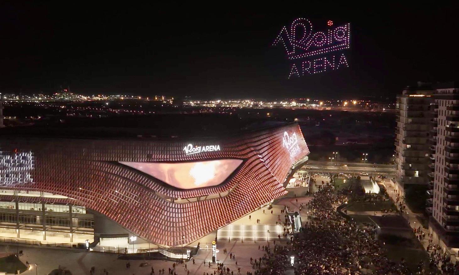 El show, que era gratuito, combinaba imágenes de la fachada y el “Ojo” del Roig Arena con la coreografía que formaban 350 drones en el cielo.