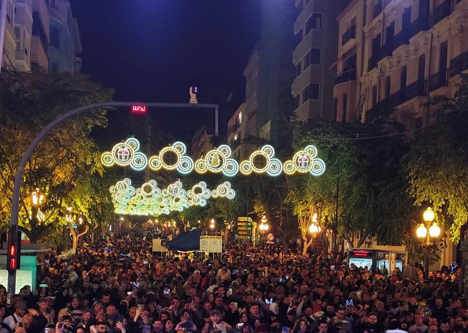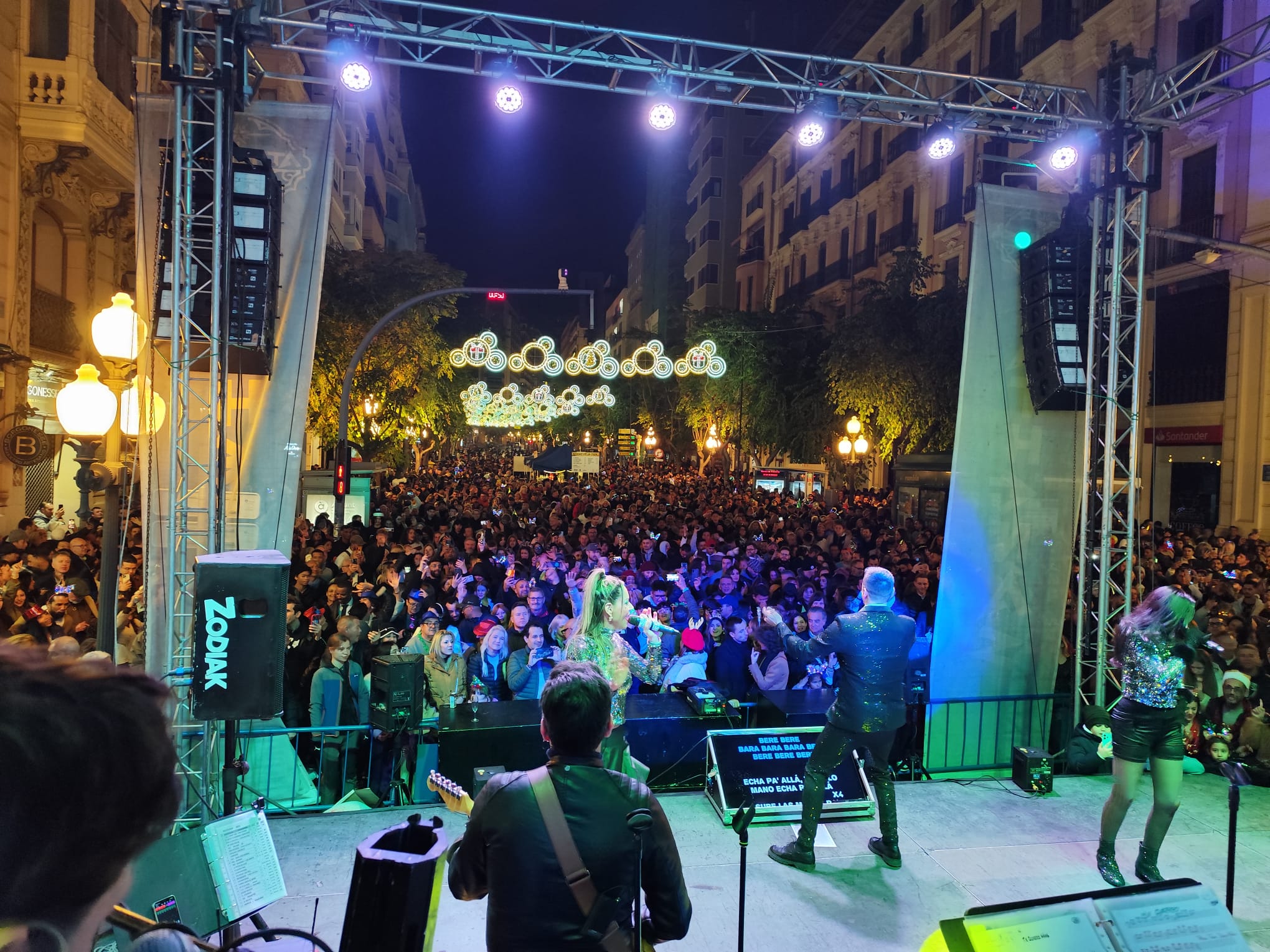 Al aproximarse la medianoche un importante flujo de personas se ha dirigido hacia la plaza del Ayuntamiento para escuchar, en directo, las doce campanadas que se han podido escuchar desde una de las torres del Palacio Consistorial. Ese esperado sonido, ampliado además, por dos potentes altavoces situados en la fachada principal. Quienes han preferido quedarse en la Rambla, han ido tomando posiciones para escuchar y poder bailar, lo más cerca posible del escenario, las canciones interpretadas por la orquesta alicantina ‘Athenas’.
