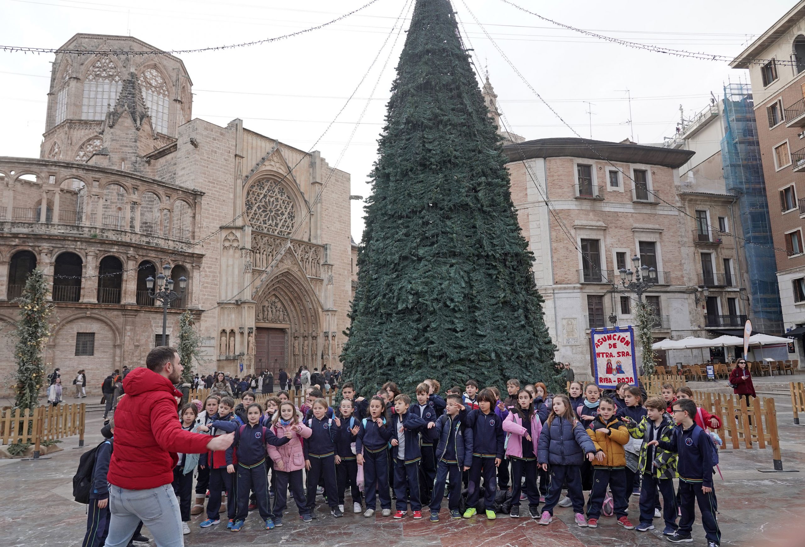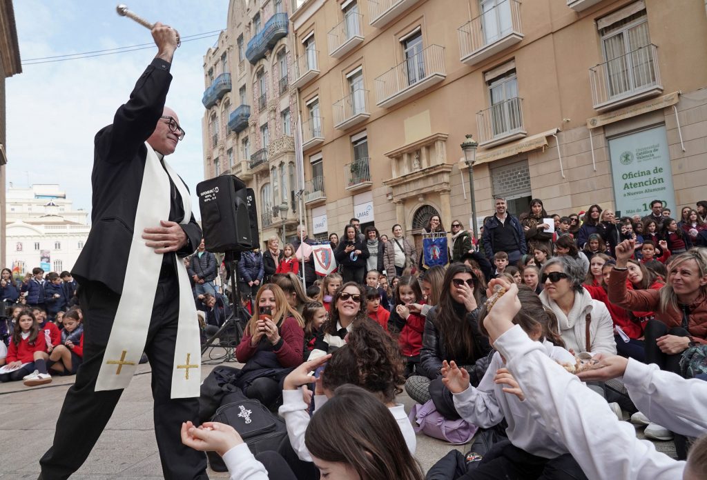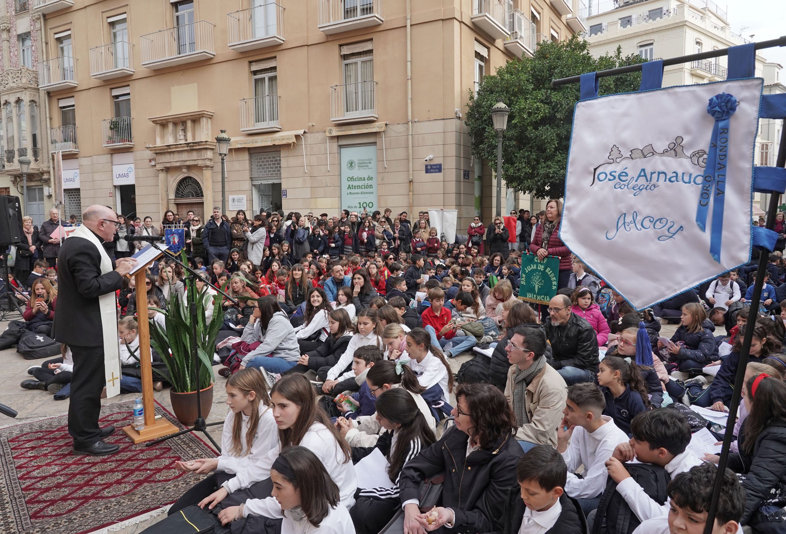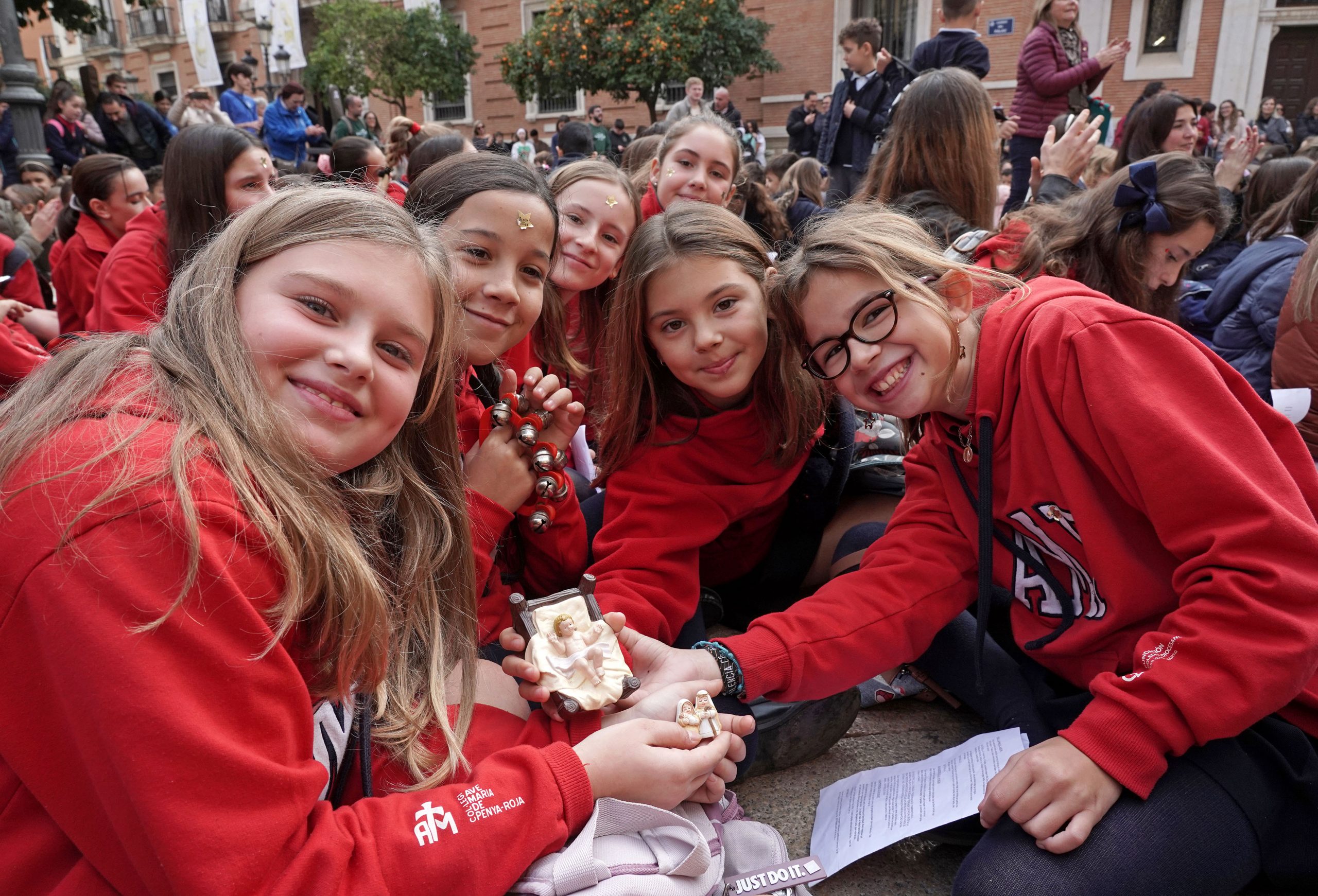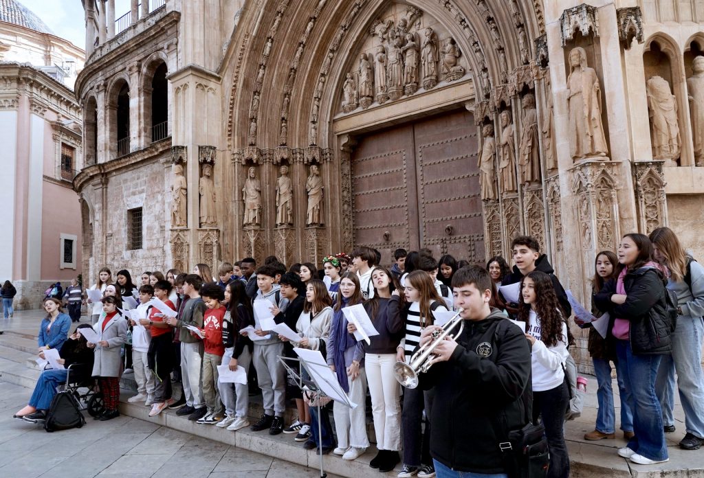Alumnos de más de 25 centros escolares, acompañados de sus profesores y algunos padres y madres, se han distribuido por varios puntos de canto, en las puertas de la Catedral, a los pies del Miguelete, en los jardines la Generalitat, en la plaza de la Almoina y por la calle Barchilla y alrededores de la Basílica.