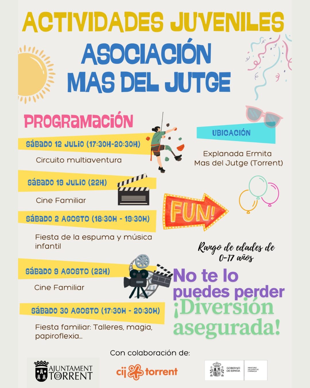 En el Mas del Jutge, las actividades comenzaron el pasado 12 de julio y se extenderán hasta el 30 de agosto, en un entorno muy especial: la explanada de la Ermita de San Vicente Ferrer, un espacio que se transforma cada sábado de este verano en un punto de encuentro para niños, adolescentes y sus familias. La programación, organizada por la Asociación Mas del Jutge, está dirigida a menores de 0 a 17 años y cuenta con una amplia variedad de propuestas que combinan el ocio con el entretenimiento familiar.