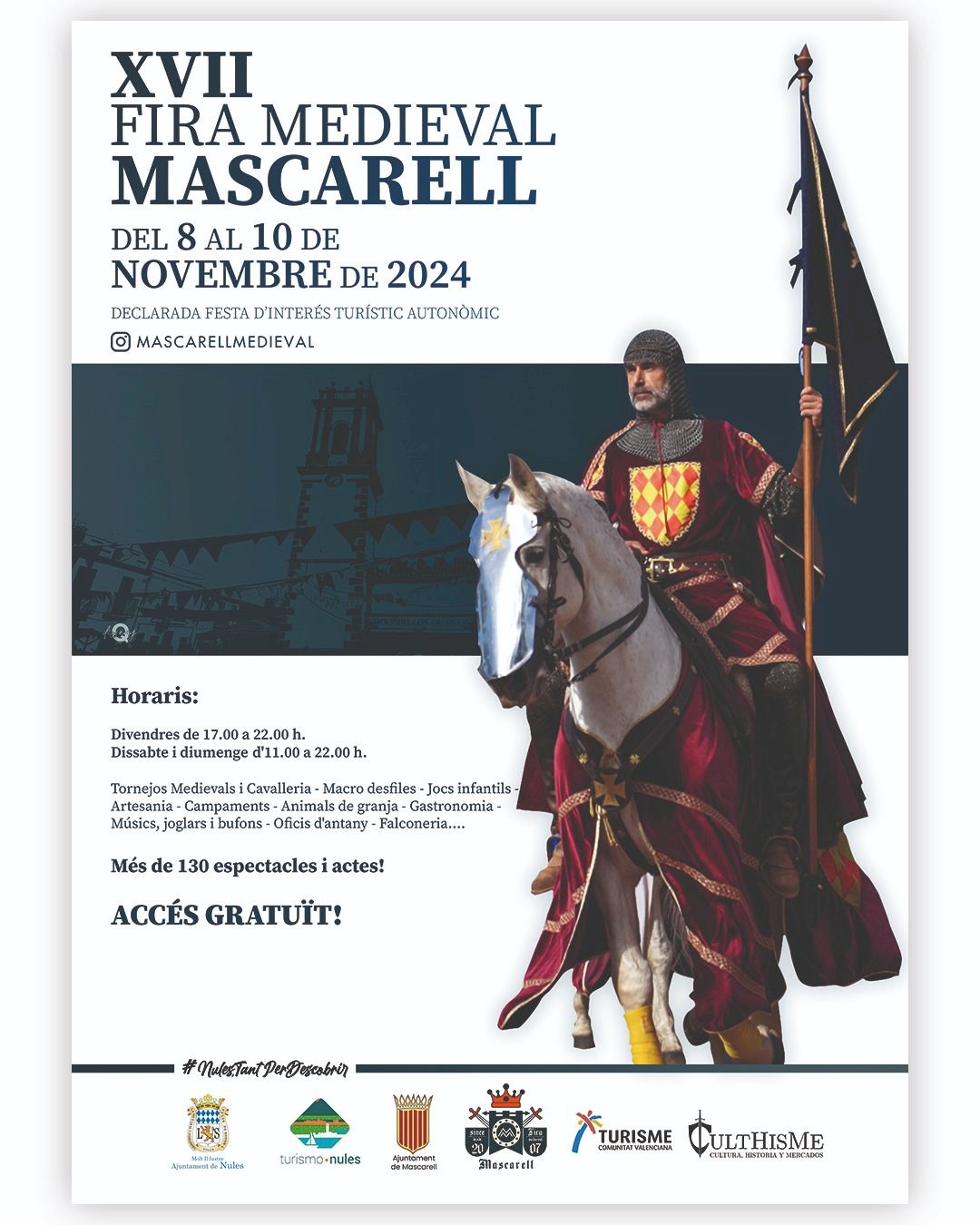 También destaca los espectáculos ecuestres se realizarán o los torneos medievales a través de los cuales todos los visitantes podrán conocer no solo como eran más justas medievales, sino parte de la historia local, ya que en el torneo participarán representantes a nivel histórico como fueron los Caballeros Centelles y Montcada, que forman parte de la historia de Nules y de Mascarell y que estaban representados en ese campo de justas. Así pues, el guion del torneo contará de manera única y cultural parte de la historia y de la vinculación que tiene la localidad de Mascarell con la época medieval.