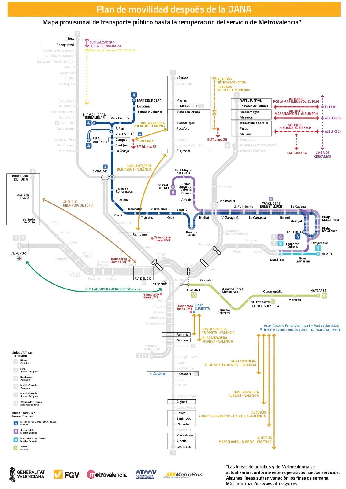 Metrovalencia ha puesto a disposición de los usuarios un mapa de movilidad actualizado que recoge las alternativas de transporte disponibles, mientras se trabaja en la restauración del servicio de metro.