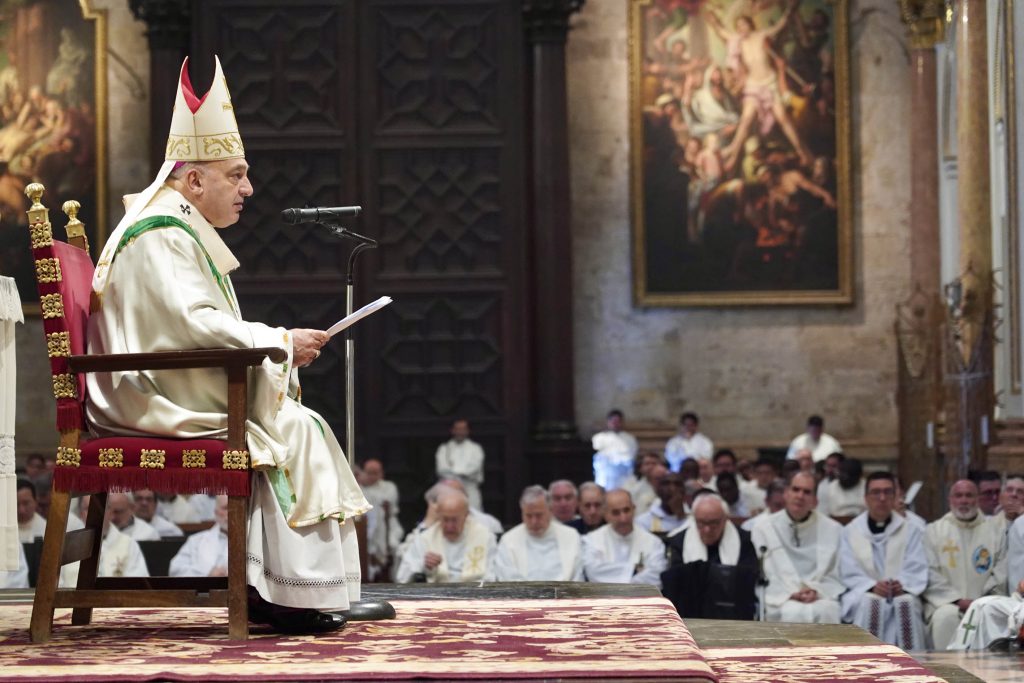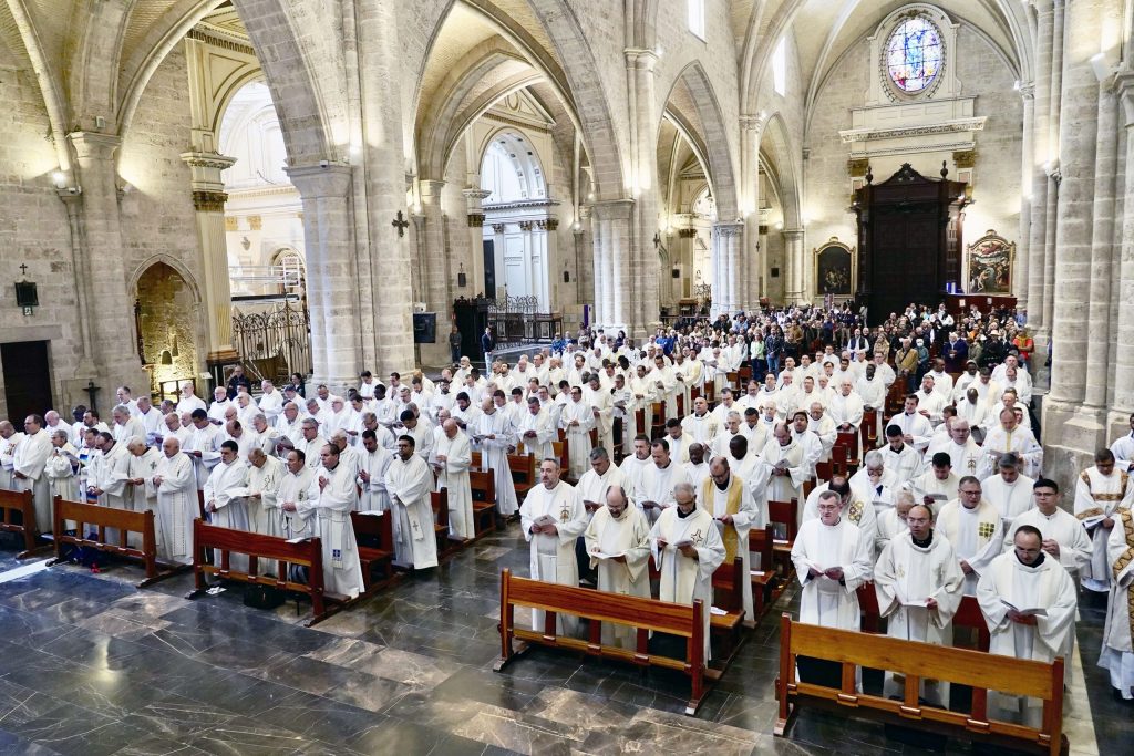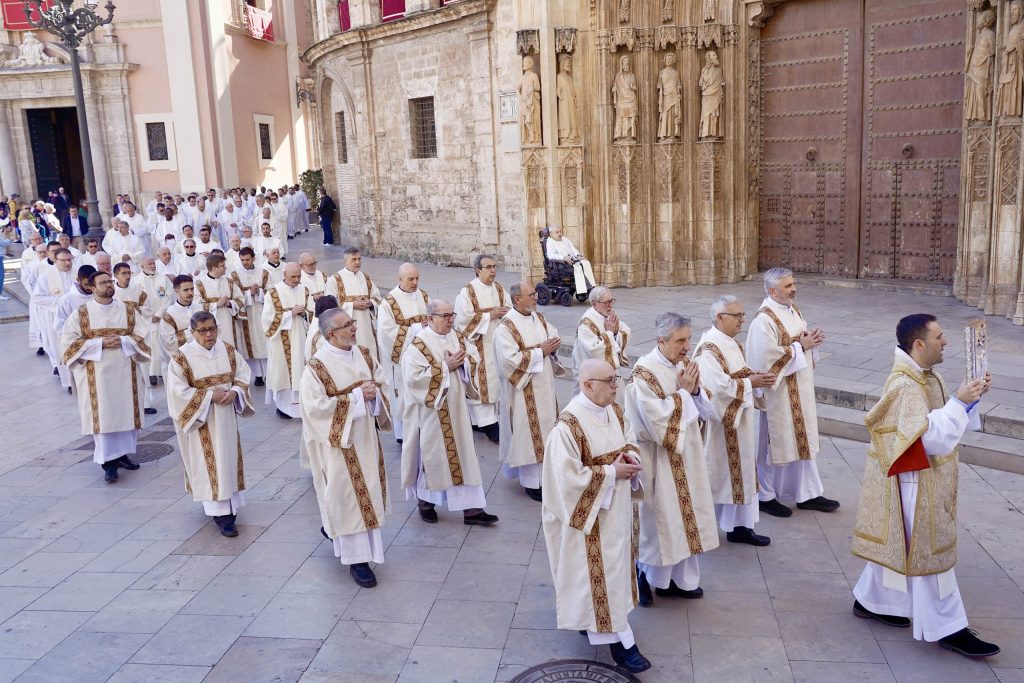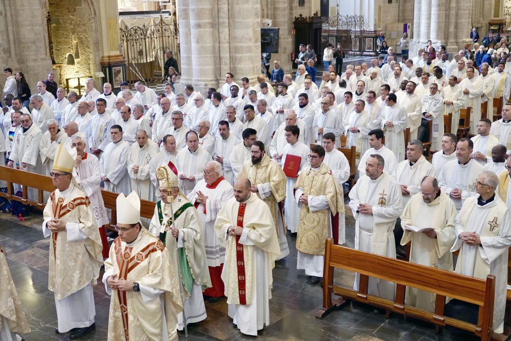El Arzobispo de Valencia, mons. Enrique Benavent, ha presidido este Miércoles Santo en la Catedral de Valencia la Misa Crismal, celebrada este año en el contexto del Jubileo del Clero con motivo del Jubileo convocado por el Papa Francisco. “Cuando cada año en esta celebración contemplo la riqueza de vida cristiana que hay en nuestra diócesis, lo vivo como un momento de gracia que me lleva a vivir mi ministerio episcopal en profunda gratitud al Señor. Quiero por ello agradeceros el esfuerzo que supone para vosotros el trabajo de cada día y vuestra entrega generosa a la misión. La Iglesia crece cuando los cristianos vivimos la propia misión como entrega de la propia vida”, ha destacado Mons. Benavent en su homilía.